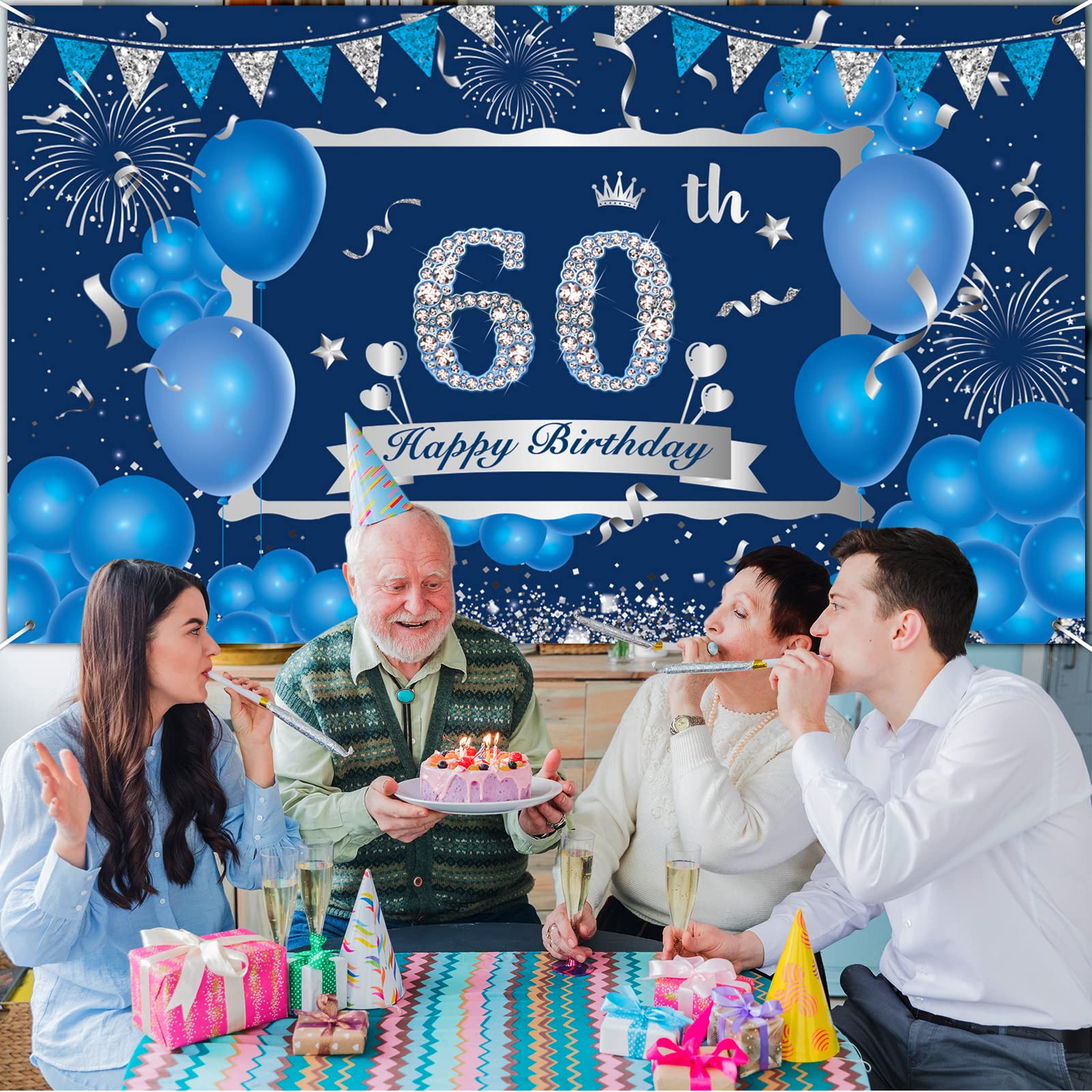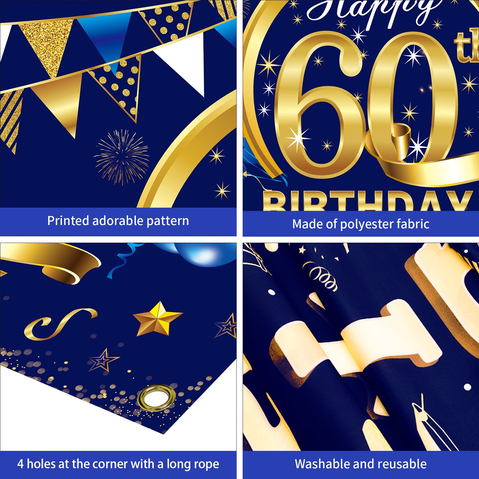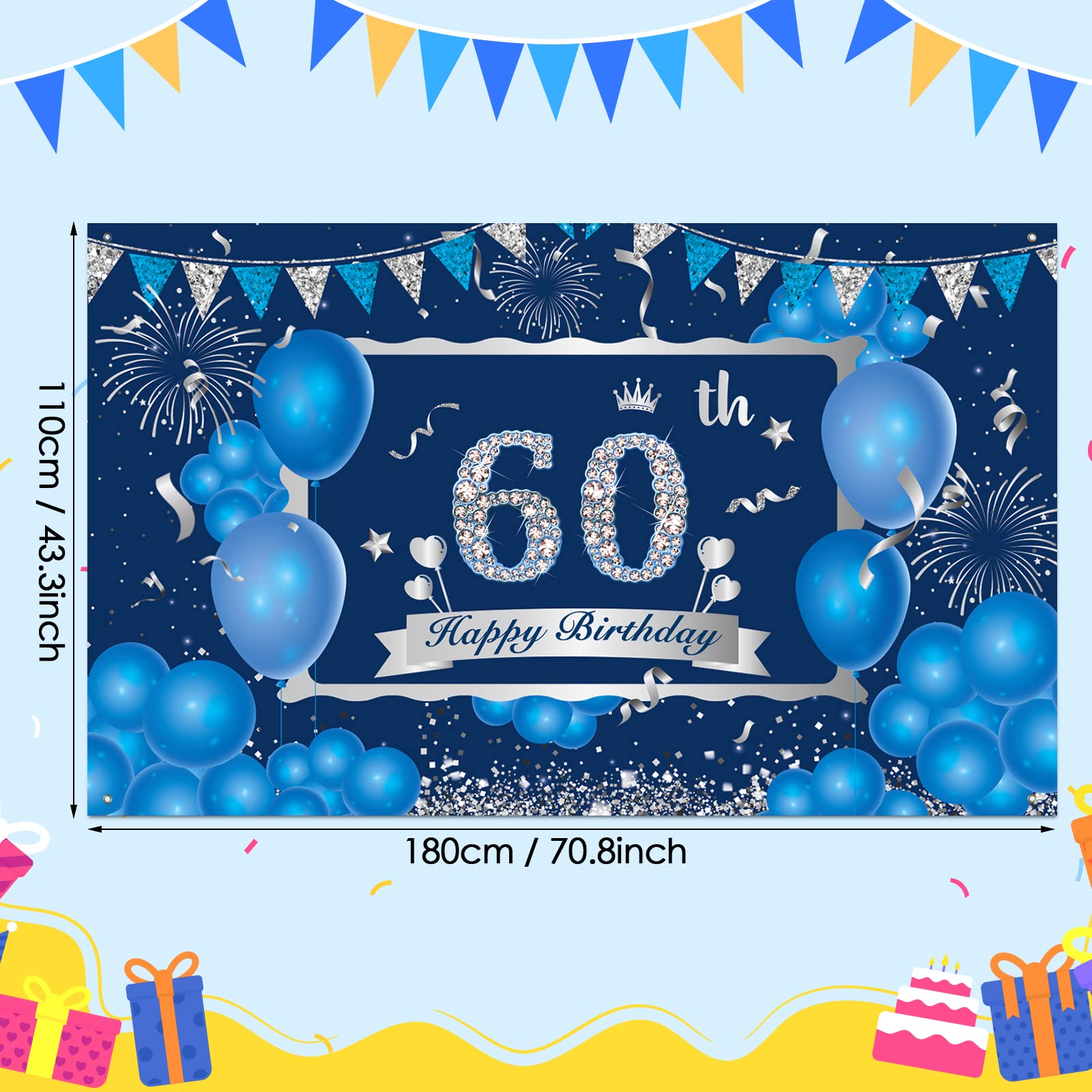 Alter, für den 60. Geburtstag ist dieses Banner einfach perfekt! In schickem Marineblau und Silber gehalten - richtig männlich und elegant. Mit 180x110cm ist es groß genug, um richtig was herzumachen, egal ob als Hintergrund für Fotos oder einfach als Deko an der Wand. Das Material ist 100D-Polyester, total strapazierfähig und sogar waschbar. Kannst du also nach der Party einfach falten und beim nächsten Jubiläum wieder verwenden. Aufhängen ist kein Problem - mit dem beiliegenden Seil und den 4 Kupferschnallen geht das ratzfatz. Das Design mit den blauen Luftballons, Feuerwerksmustern und der silbernen '60' sieht einfach klasse aus. Perfekt für deinen Vater, Bruder oder Opa - die werden sich tierisch freuen! Ob für ne Geburtstagsfeier mit blauem Motto oder einfach so als Highlight - damit machst du auf jeden Fall was her.