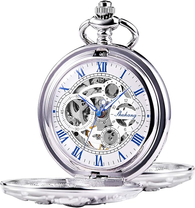 Wow, diese MICGIGI Taschenuhr ist ein richtiger Hingucker! Im silbernen Metalllegierungs-Gehäuse mit Acrylglas-Vorderseite und skelettiertem Vorwahlknopf. Die mechanische Uhr kommt ohne Batterie aus - einfach die Krone etwa 25 Mal im Uhrzeigersinn aufziehen und sie läuft! Mit 4,6 cm Durchmesser ist sie handlich aber gut ablesbar. Im Lieferumfang sind zwei Ketten: eine 37,5 cm Standard-Taschenuhrkette und eine 80 cm Pullover-Kette für mehr Tragevarianten. Plus eine Geschenktasche - perfekt verpackt! Wichtig: Nicht in die Nähe von Magnetfeldern bringen (Handys, Kühlschränke etc.), sonst kann die Uhr ungenau gehen. Ein tolles Geschenk für Geburtstage, Weihnachten, Hochzeiten oder einfach für dich selbst!