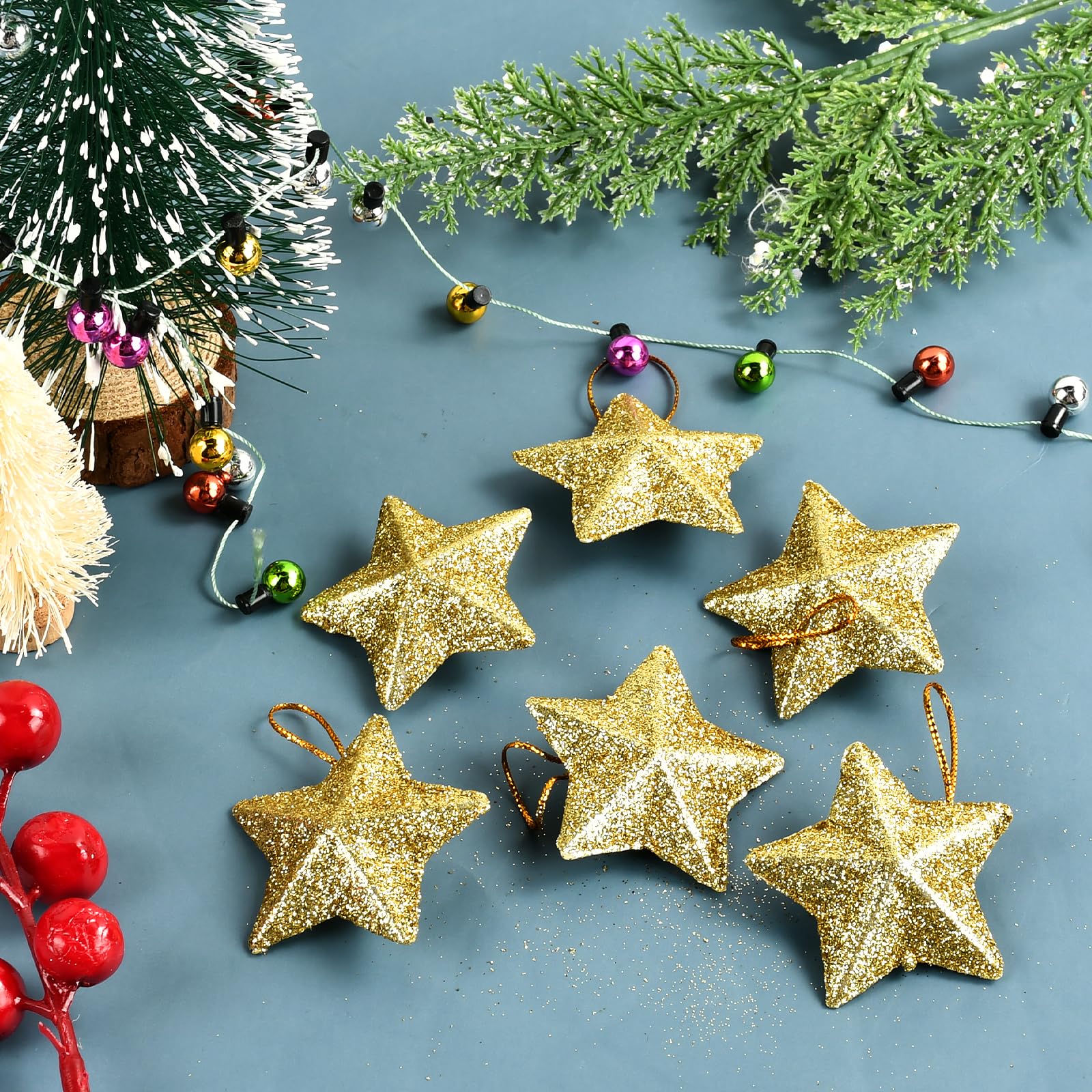 Mach deinen Weihnachtsbaum zum Hingucker! Diese 24 silbernen Weihnachtssterne glitzern wunderschön und fangen jedes Licht ein. Jeder Stern hat etwa 5cm Durchmesser und kommt mit vormontierter Aufhängeschnur - einfach an den Baum hängen und fertig! Aus hochwertigem PVC - leicht aber langlebig. Perfekt für Weihnachtsbaum, Girlanden, Fenster oder Tischdekoration. Das silberne Finish passt zu jedem Weihnachtsthema und sieht edel aus. Ob für die eigene Wohnung oder als Geschenk - diese Sterne bringen festliche Stimmung ins Haus. Einfach aufhängen und dich am Glitzern erfreuen - so wird Weihnachten magisch!