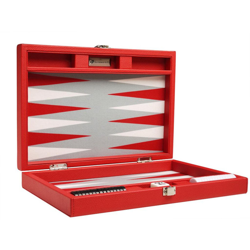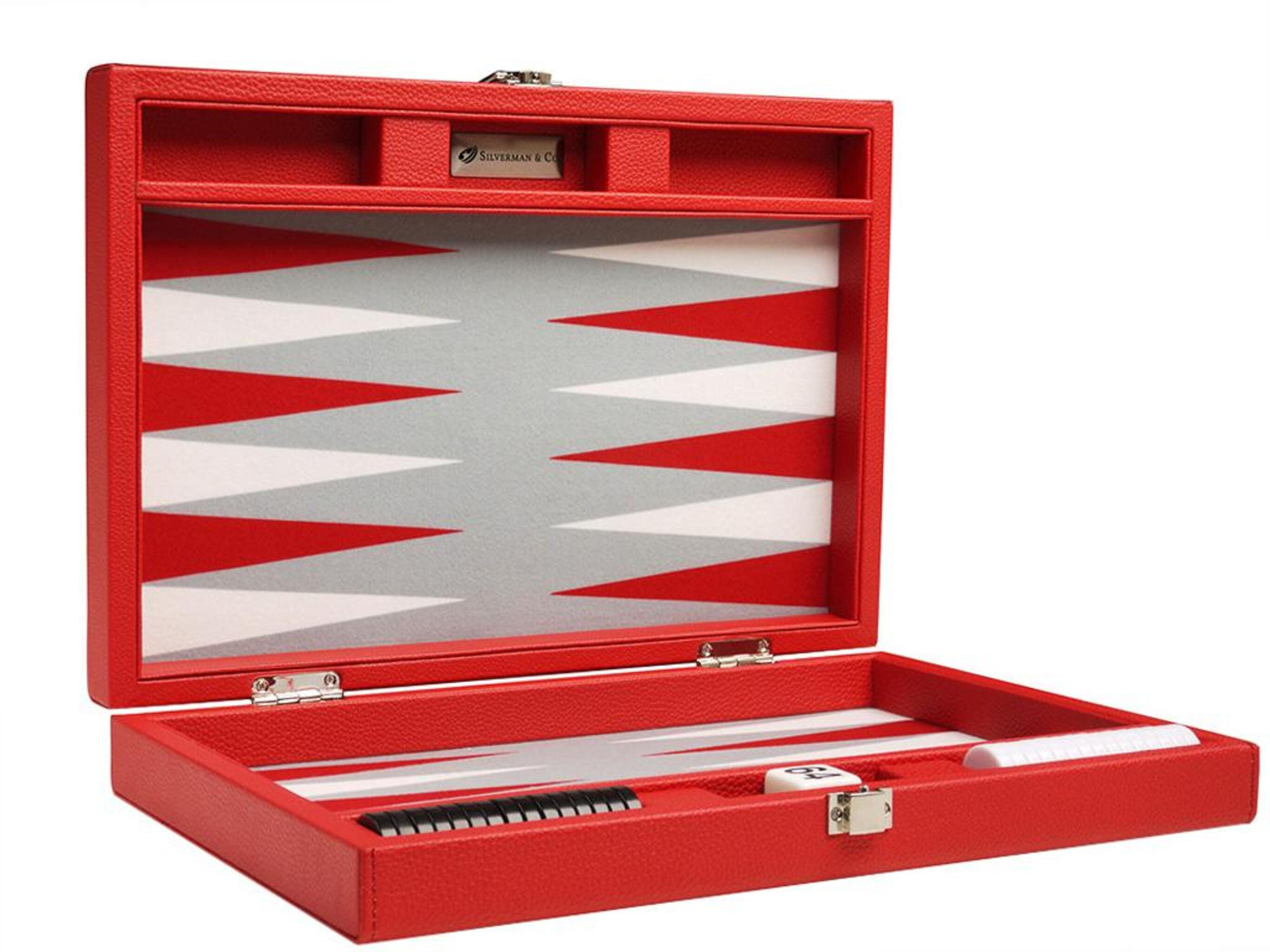 Würfeln um den Sieg! Dieses elegante Silverman & Co. Backgammon-Set in Reisegröße (33cm) macht jedes Spiel zum Event. Schwarzes Brett mit scharlachroten und patriotblauen Punkten - einfach stylisch! Aus hochwertigem Kunstleder mit gepolsterter Filz-Spielfläche. Die Spielsteine (2,5cm Durchmesser) passen perfekt ins Board. Inklusive ovalem Würfelbecher mit Filzfutter für leises Würfeln, Doppelwürfel und normale Würfel. Stabiler Verschluss und robuster Griff - ideal für unterwegs. Ob zuhause, im Urlaub oder beim Spieleabend - damit hast du jahrelang Spaß. Einfach aufklappen und losspielen!