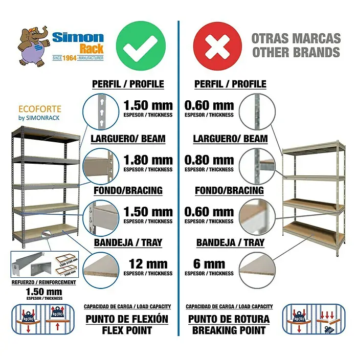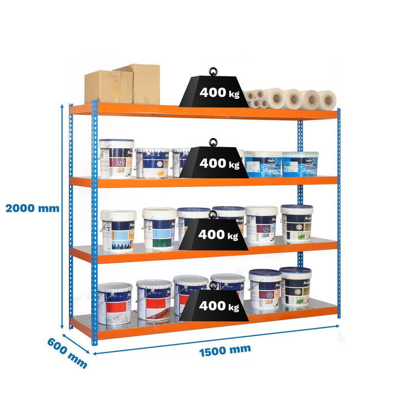 Massives Simonrack Schwerlastregal für Garage, Keller oder Werkstatt! Maße: 150cm hoch, 120cm breit, 30cm tief mit 4 Regalböden. Jeder Boden trägt bis zu 200kg - das ist echt stabil! Schraubenlose Montage - super einfach mit bebilderter Anleitung. Aus europäischem Stahl nach EN 10130, 1,5mm stark. Mit Kunststofffüßen zum Schutz deiner Böden. Wackelt nicht, muss nicht an der Wand befestigt werden. Europäische Qualität vom Feinsten!