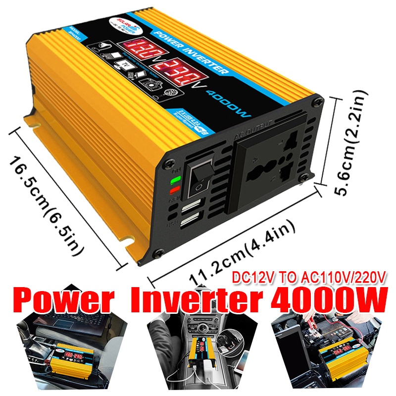 Leistungsstarker 4000W Wechselrichter für dein Auto oder Outdoor-Abenteuer! Wandelt zuverlässig 12V Gleichstrom aus deiner Autobatterie in 220V Wechselstrom um - perfekt für Fernseher, Laptops, kleine Kühlschränke oder sogar Reiskocher unterwegs. Die reine Sinuswelle garantiert kompatiblen Betrieb mit empfindlichen Elektrogeräten. Mit 4 USB-Anschlüssen kannst du gleichzeitig Smartphones, Tablets und andere Kleingeräte laden. Das praktische LCD-Display zeigt dir immer den aktuellen Status an. Der Wechselrichter verfügt über umfassenden Schutz vor Überspannung, Überlastung, Kurzschluss und Überhitzung. Der automatische Lüfter kühlt leise und effizient, während die hochwertige Aluminiumlegierung für optimale Wärmeableitung sorgt. Die Installation ist denkbar einfach - verwende einfach die mitgelieferten Kabel und schon geht's los! Achte darauf, dass du ausreichend dicke Kabel verwendest, um Leistungsverluste zu minimieren. Ideal für Camping-Ausflüge, Roadtrips oder als Notstromversorgung zu Hause. Mit einer Dauerleistung von 2000W und einer Spitzenleistung von 4000W meisterst du die meisten Alltagsgeräte problemlos. Mach dich unabhängig von Steckdosen und genieße Komfort wherever du bist!