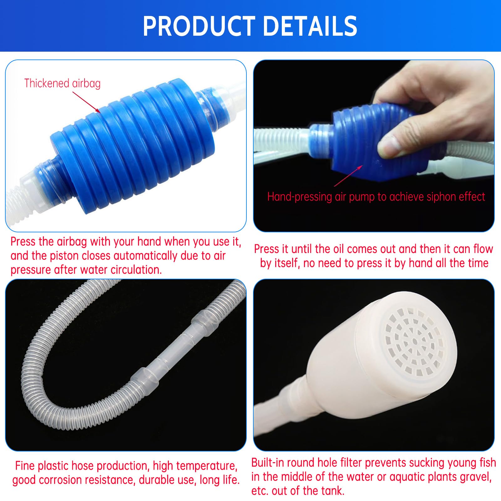 Schluss mit mühsamen Aquarium-Reinigungen! Dieser praktische Kiesreiniger macht die Pflege deines Aquariums zum Kinderspiel. Mit ca. 2,1 m Länge erreichst du auch die hintersten Ecken bequem.\n\nDas intuitive Siphon-System ist perfekt für Anfänger - einfach pumpen und schon fließt das Schmutzwasser ab. Dabei reinigt es gleichzeitig den Kies von Futterresten und Fischausscheidungen. Das verstellbare Durchflussventil gibt dir die totale Kontrolle über den Wasserstand.\n\nNicht nur für Aquarien mit Guppys, Bettas oder Garnelen geeignet, sondern auch für Reptilienbecken und kleine Gartenteiche. Die ergonomische Form passt sich sowohl rechteckigen als auch abgerundeten Becken perfekt an.\n\nMit nur 80 g Gewicht ist der Reiniger super leicht, aber trotzdem stabil. Aus robustem Polypropylen gefertigt, hält er lange und ist einfach zu reinigen.\n\nFür ein gesundes Aquarium-Milieu ist regelmäßige Reinigung essentiell. Dieses Tool hilft dir, das biologische Gleichgewicht zu halten, ohne die nützlichen Bakterien zu stören. Deine Fische werden's dir danken - und du sparst Zeit und Nerven!