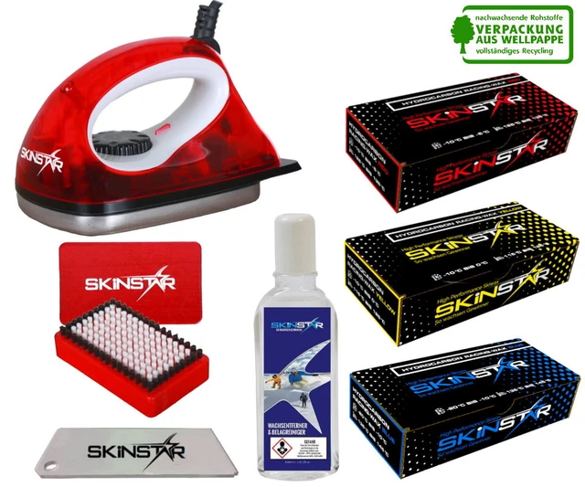 Bereit für die Piste? Unser SkinStar Skiwachs Set hat alles, was du für perfekt präparierte Skier brauchst! Das 11-teilige Komplettset ist ideal für Einsteiger und Profis gleichermaßen.\n\nEnthalten sind: 1 Wachseisen, 3 verschiedene Bürsten (Nylon, Rosshaar, Kupfer/Bronze), 4 High-Performance Wachse für verschiedene Temperaturen, 1 Abziehklinge, 1 Polierkork und Wachsentferner. So bist du für jede Schneeart und Temperatur bestens ausgerüstet!\n\nDie Wachse sind weltcuperprobt und liefern Top-Ergebnisse. Gelb für 0° bis -5°C, Rot für -10° bis -5°C und Blau für -10° bis -20°C. Plus ein spezielles Flour Wax für ultimative Performance.\n\nEgal ob Alpin Ski, Snowboard oder Langlauf - dieses Set macht deine Bretter pistentauglich. Einfach in der Anwendung und mit professionellen Ergebnissen. Perfekt als Geschenk für Ski-Begeisterte oder zum Aufrüsten deiner eigenen Ausrüstung.\n\nMit SkinStar fährst du garantiert schneller und smoother den Hang runter. Worauf wartest du noch? Mach deine Skier fit für die nächste Abfahrt!