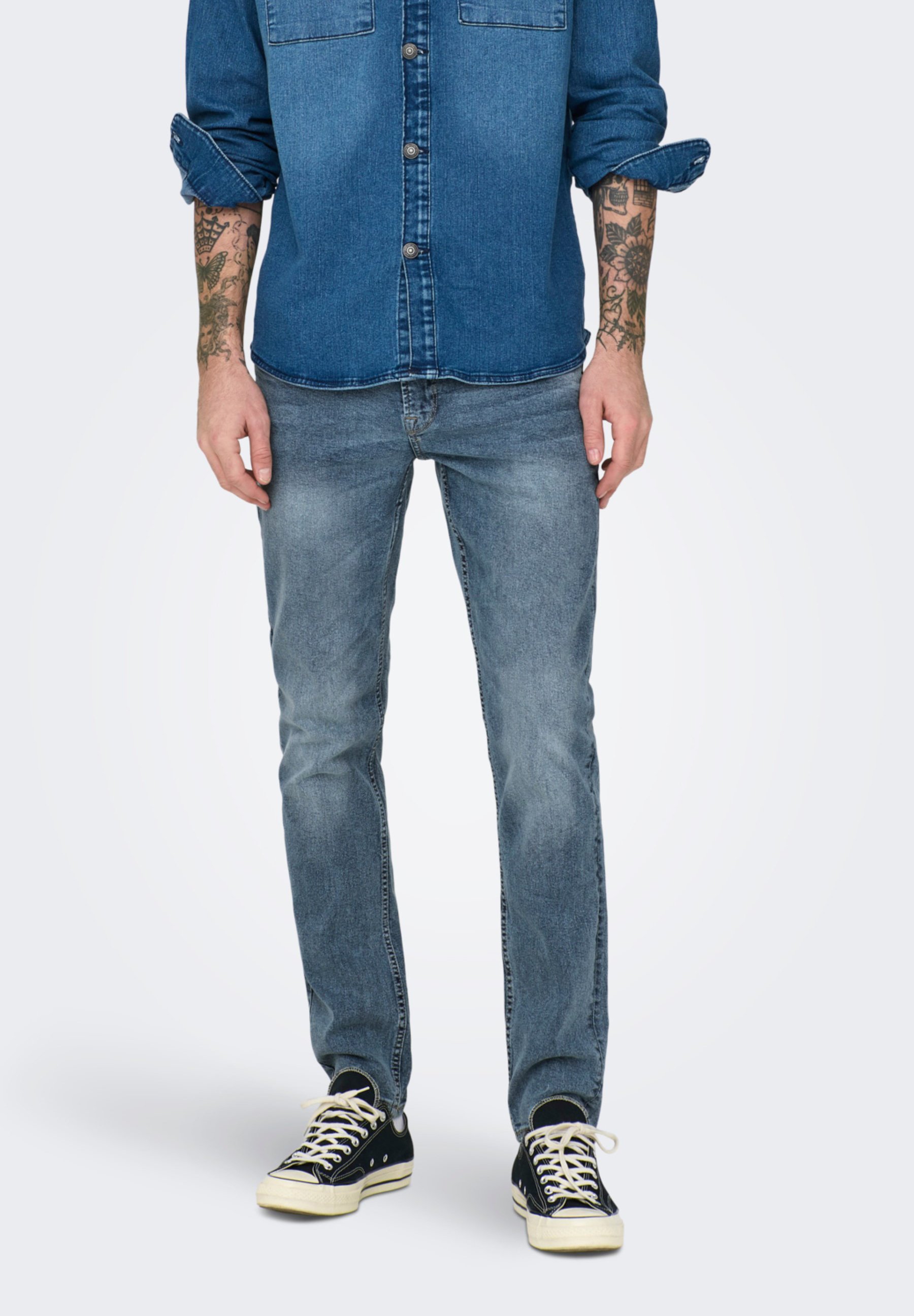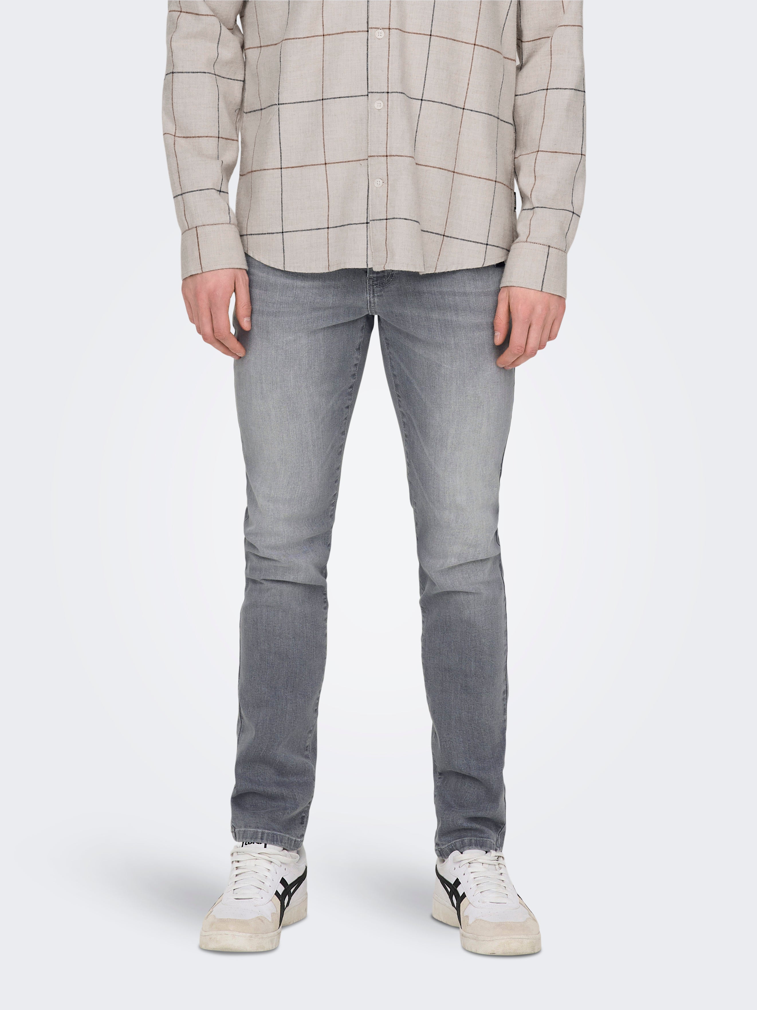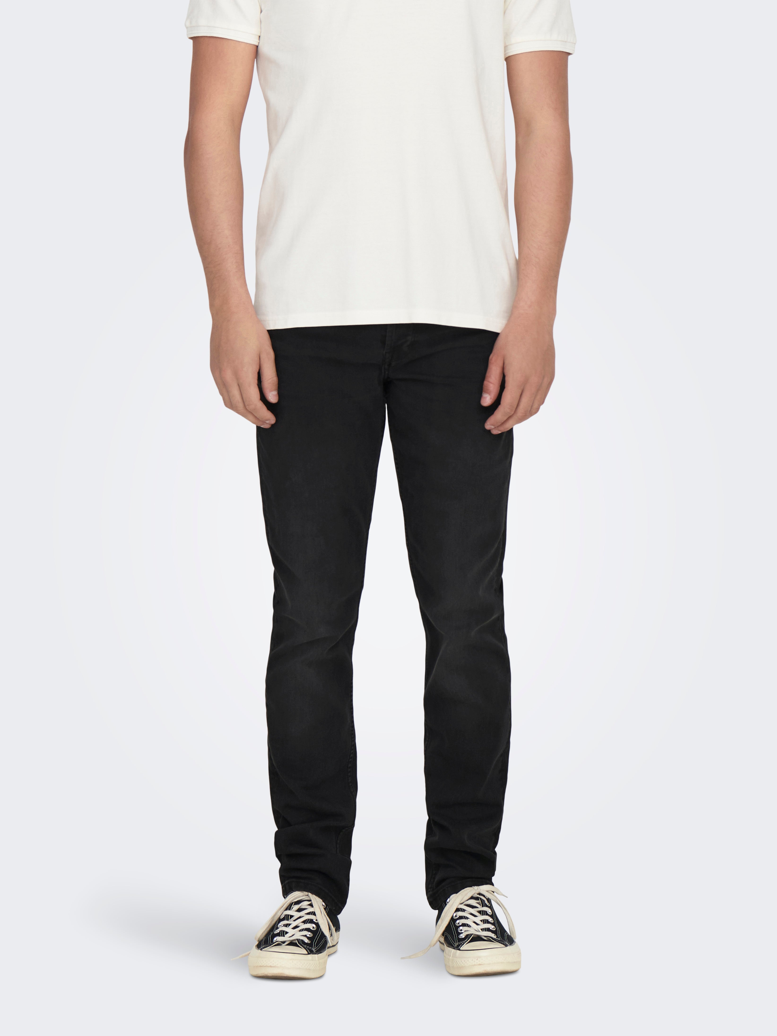 Die perfekte Alltagsjeans für Herren! ONLY & SONS bringt mit dieser Slim Fit Jeans Komfort und Style unter einen Hut. Die Stretch-Qualität passt sich deiner Bewegung an - du fühlst dich den ganzen Tag wohl, ohne auf guten Look zu verzichten.\\n\\nMid Rise Schnitt sitzt genau richtig - nicht zu hoch, nicht zu tief. Die 99% Baumwolle mit 1% Elasthan macht die Jeans strapazierfähig und dabei pflegeleicht. Sie dehnt sich, wo's nötig ist, behält aber ihre Form.\\n\\nPerfekt für Office, Freizeit oder abends in der Stadt - diese Jeans passt zu allem. Kombinier sie mit T-Shirt und Sneakers für lässigen Look oder mit Hemd und Schuhen für einen schickeren Anlass.\\n\\nDie Qualität überzeugt: Robuster Denim, der sich weich anfühlt und nicht einläuft. Pflegeleicht waschbar und langlebig in der Verarbeitung. Ob du den ganzen Tag unterwegs bist oder es dir gemütlich machst - diese Jeans wird deine neue Lieblingshose. Einfach anziehen und wohlfühlen!