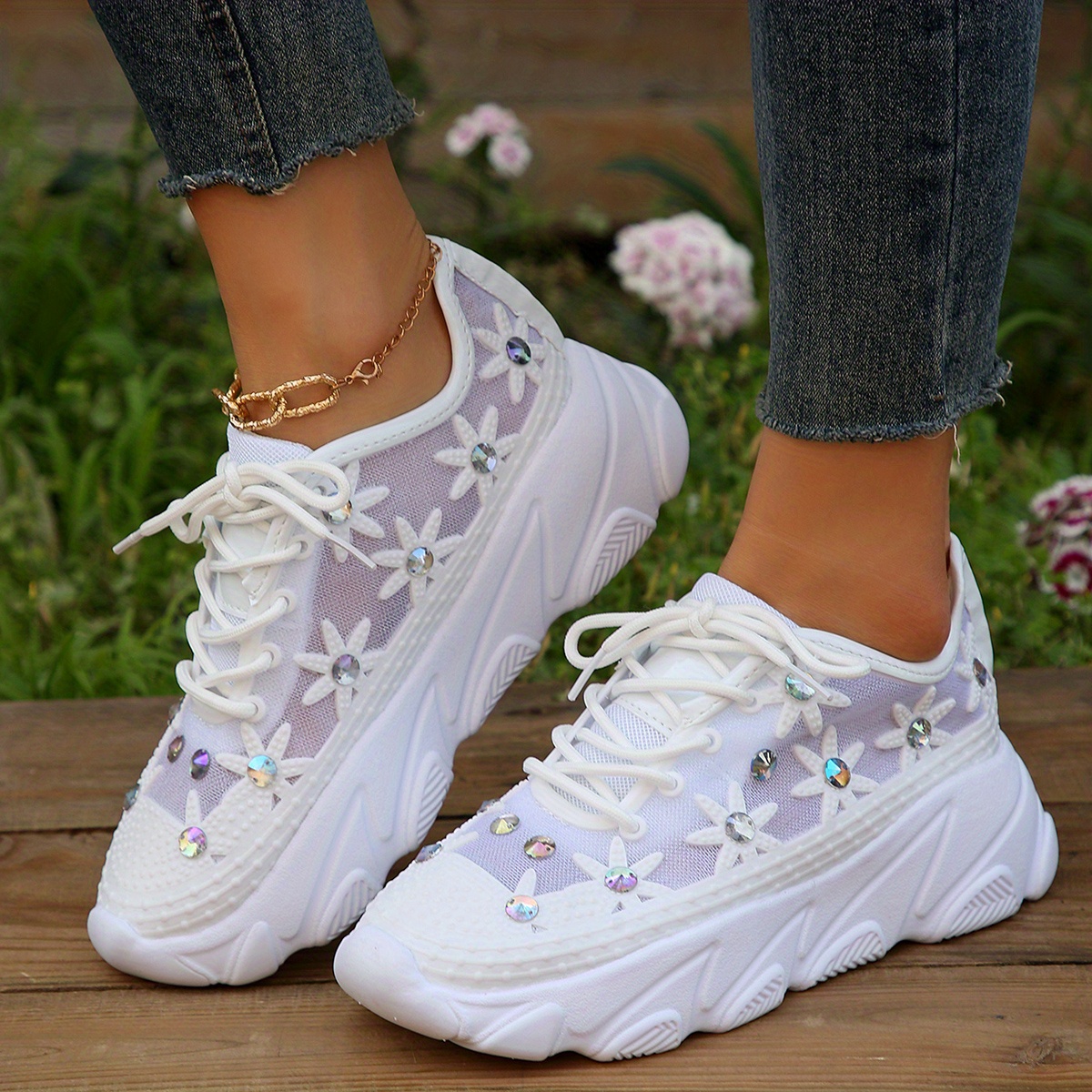 • Damen Wedge Sneakers Mit Strass - Mesh Slip On Sneaker Mit 6cm Keilabsatz, Bequem & Glamourös