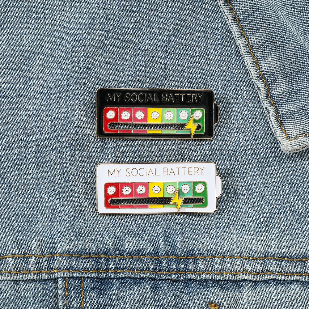 Wie voll ist dein sozialer Akku heute? Zeig's allen mit diesen coolen Pins! 6 Stück in Schwarz-Weiß, je 5,2x2,1cm groß. Mit Schieberegler für 7 Emotionen - von fröhlich bis platt. Aus hochwertiger Zinklegierung mit glatter Emaille-Oberfläche - kratzfest und langlebig. Perfekt für Jacken, Rucksäcke, Taschen oder Hüte. Super für Introvertierte oder alle die ihre Stimmung ohne Worte zeigen wollen. Macht jedes Outfit persönlicher! Tolles Geschenk für Freunde, Familie oder Kollegen. Einfach ein lustiges und ehrliches Accessoire für den Alltag - zeig der Welt wie's dir geht!