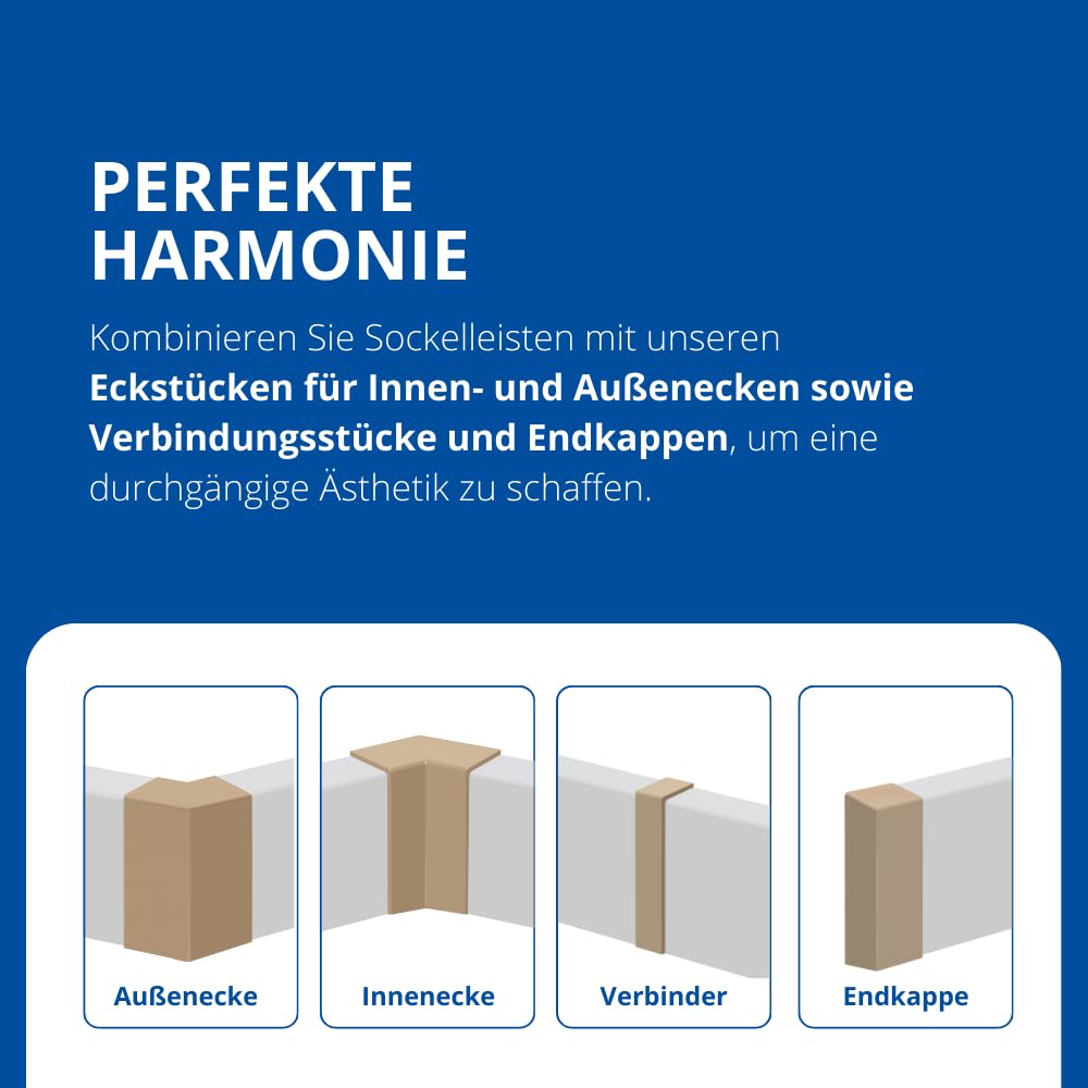 Du baust gerade um und willst, dass alles perfekt aussieht? Diese Endkappe für Sockelleisten gibt deinem Raum den letzten Schliff! Sie wird einfach links angebracht und verdeckt das offene Ende der Leiste - so sieht alles sauber und professionell aus. Aus hochwertigem ABS gefertigt, ist sie langlebig und passt perfekt zur Sockelleiste 'Profil Leipzig'. Montage ohne Bohren oder Schnitte - einfach draufstecken und fertig. Hergestellt in Deutschland, also Qualität, der du vertrauen kannst. Kombiniere sie mit passenden Eckstücken für ein harmonisches Gesamtbild. Kleines Teil, große Wirkung - mach deine Renovierung perfekt!