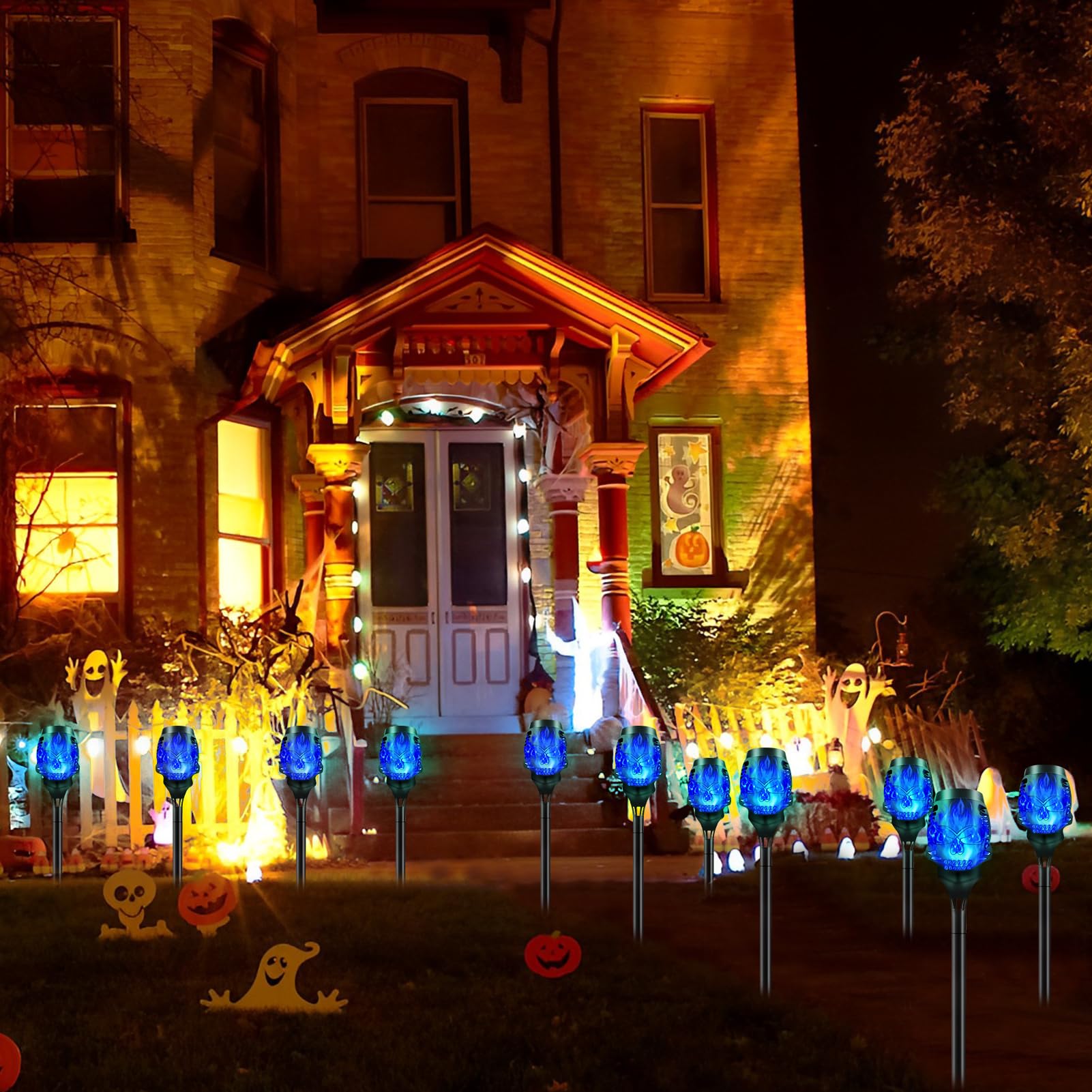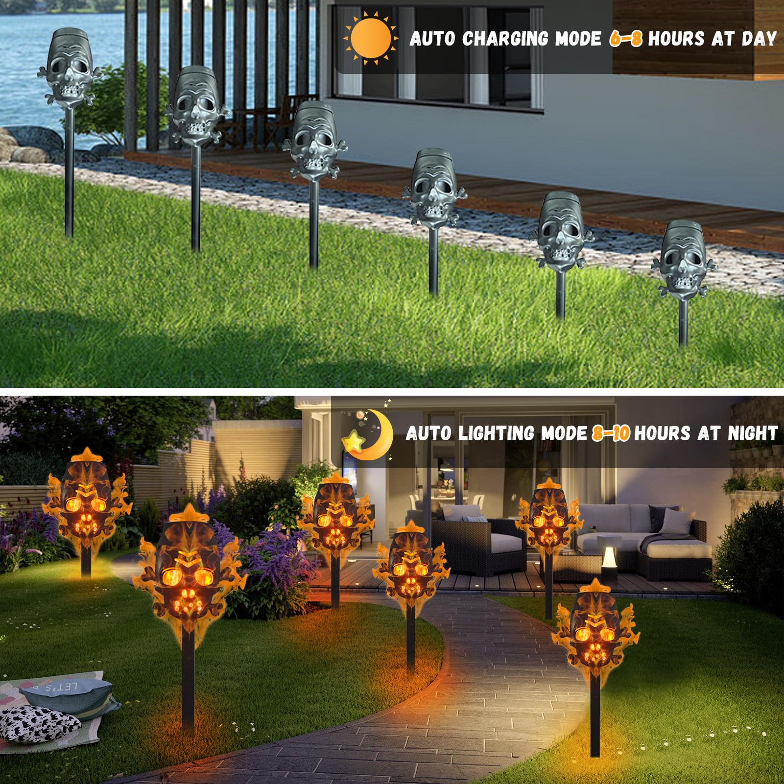 • 2 Stück Solar Schädel Fackeln Outdoor - Realistischer Flammeneffekt, Wasserdicht Für Garten Deko