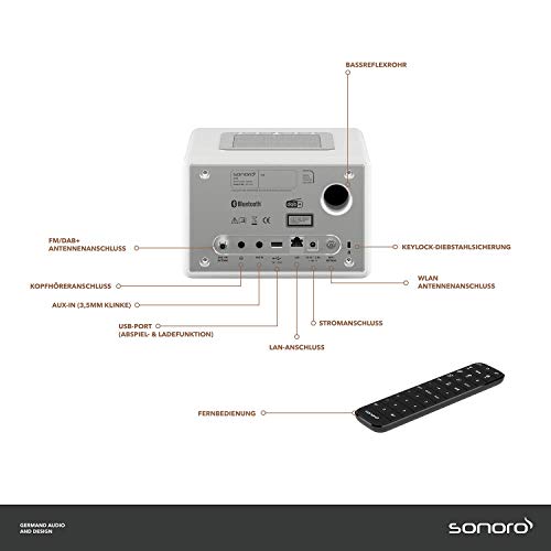 Musikgenuss auf höchstem Niveau! Das sonoro Elite vereint modernste Technik mit elegantem Design in Silber. Genieße deine Musik über Internetradio mit Zugang zu über 25.000 Sendern, DAB+ Digitalradio, UKW oder per CD über den praktischen Slot-In Player. Streame deine Lieblingsplaylists direkt über Spotify Connect, Deezer oder Amazon Music. Der nach oben gerichtete 3-Zoll Breitbandlautsprecher mit Bassreflexröhre erzeugt ein beeindruckendes 360° Klangbild. Besonders praktisch: Die duale Weckfunktion mit Schlummerfunktion, das automatisch dimmbare Display und die Bluetooth-Verbindung für kabelloses Streaming. Perfekt für Schlafzimmer oder Arbeitszimmer. Das handgeschliffene Gehäuse mit abgerundeten Ecken und hochwertigem Lack macht das Elite zu einem echten Hingucker. Plus X Award Preisträger für Qualität und Design - überzeuge dich selbst vom herausragenden Klangerlebnis!