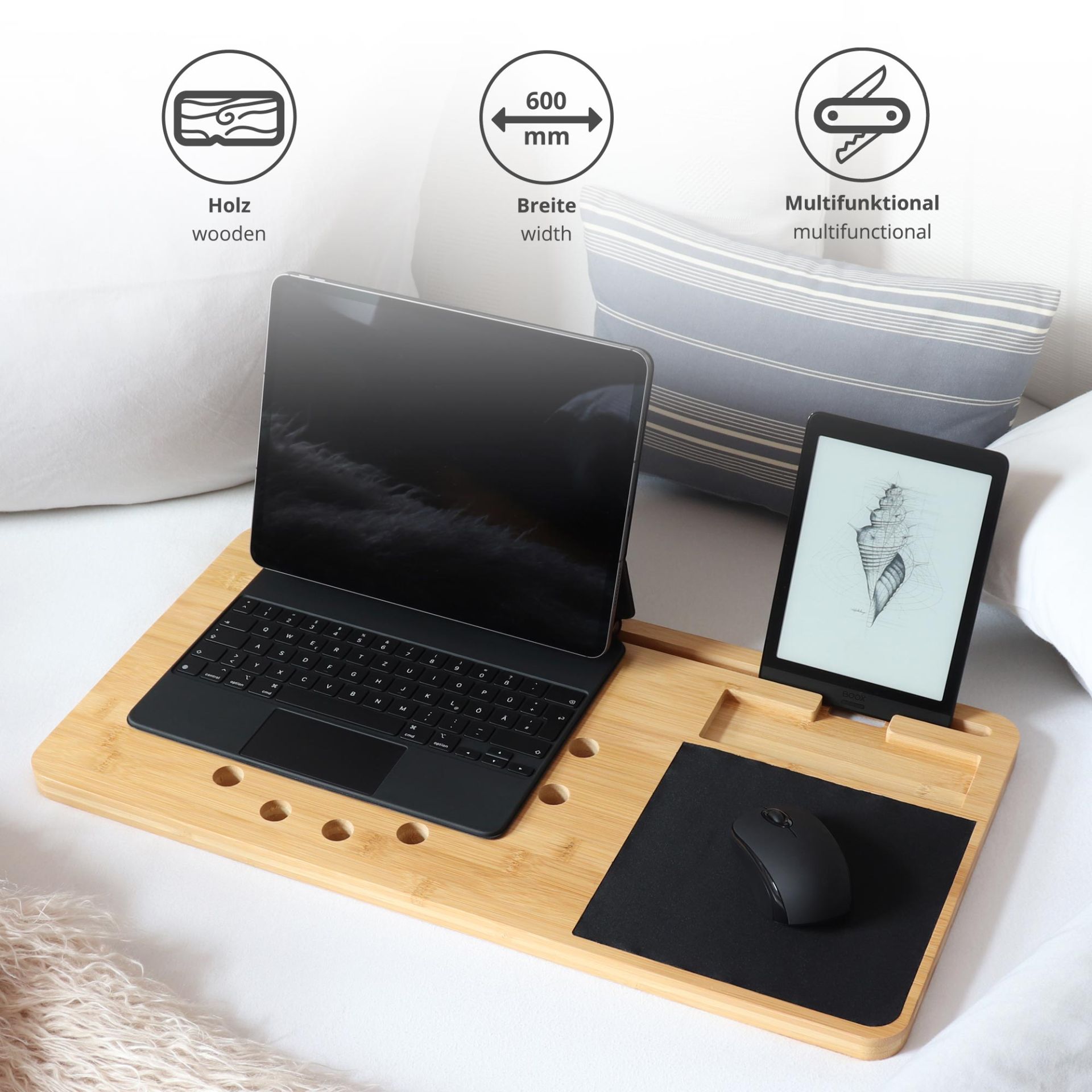 Hey Gemütlichkeits-Liebhaber! Dieser Soontrans Laptoptisch ist die Rettung für alle, die gerne mal im Bett oder auf der Couch arbeiten! Mit den perfekten Maßen 60x40x28cm bietet er genug Platz für Laptop, Dokumente und sogar das Mittagessen.\\n\\nDas durchdachte Design hat alles, was du brauchst: Eine spezielle Rille für Tablet oder Smartphone (bye-bye Nackenschmerzen!), einen sicheren Getränkehalter gegen Umkipper und eine versteckte Schublade für Krimskrams.\\n\\nAufbau? Mega einfach! In 3 Sekunden ohne Werkzeug aufklappen - und schon steht der stabile Tisch mit seiner Hochdichte-Faserplatte und dem Metallgestell bombenfest. Wenn du ihn nicht brauchst, einfach zusammenklappen und unterm Bett oder Sofa verstauen.\\n\\nPerfekt für Home-Office, Studenten, Kranke oder einfach für gemütliche Filmabende. Ob am Boden, im Bett oder auf der Couch - dieser Tisch macht einfach alles bequemer. Ein echter Game-Changer für alle, die Flexibilität und Komfort lieben!
