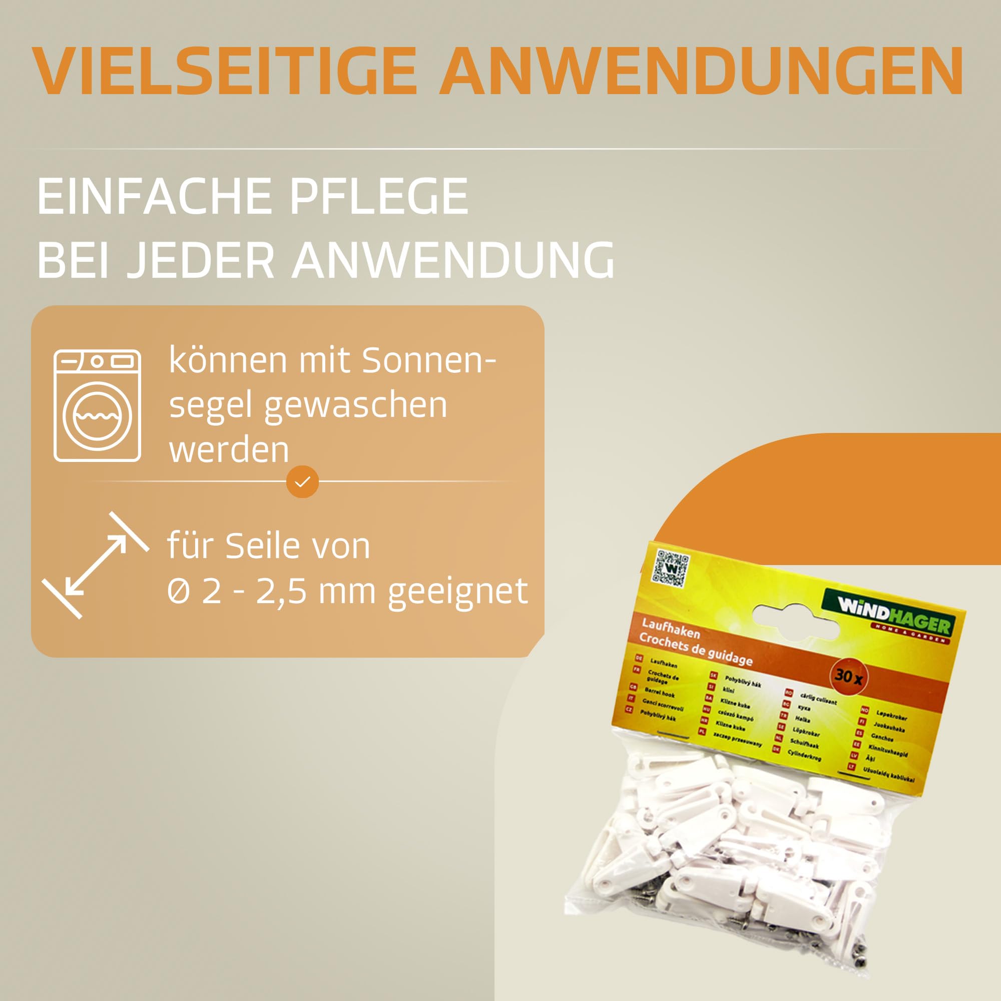 Dein Sonnensegel optimal befestigt - mit diesen praktischen Laufhaken von Sopomarkt24! Das Set enthält 20 hochwertige Haken aus UV-beständigem Kunststoff mit robusten Stahlschrauben. Perfekt geeignet für Edelstahlseile mit 2-2,5 mm Durchmesser. Die Montage ist denkbar einfach: Haken am Stoff positionieren, Schraube eindrehen - fertig! Mit einem Abstand von etwa 30 cm zwischen den Haken sitzt dein Segel perfekt und stabil. Besonders praktisch: Die Haken sind waschbar und können mit dem Segel in die Maschine. Für noch bessere Gleitfähigkeit einfach ab und zu ein paar Tropfen Öl aufs Seil geben. So lässt sich dein Sonnensegel ganz leicht verschieben und genau dort positionieren, wo du den meisten Schatten brauchst. Die Materialien halten auch bei intensiver Sonneneinstrahlung und verschiedenen Wetterbedingungen problemlos stand. Ob auf der Terrasse, im Garten oder auf dem Balkon - mit diesen Haken machst du alles richtig. Eine wirklich clevere Lösung für mehr Flexibilität bei der Sonnensegel-Befestigung!