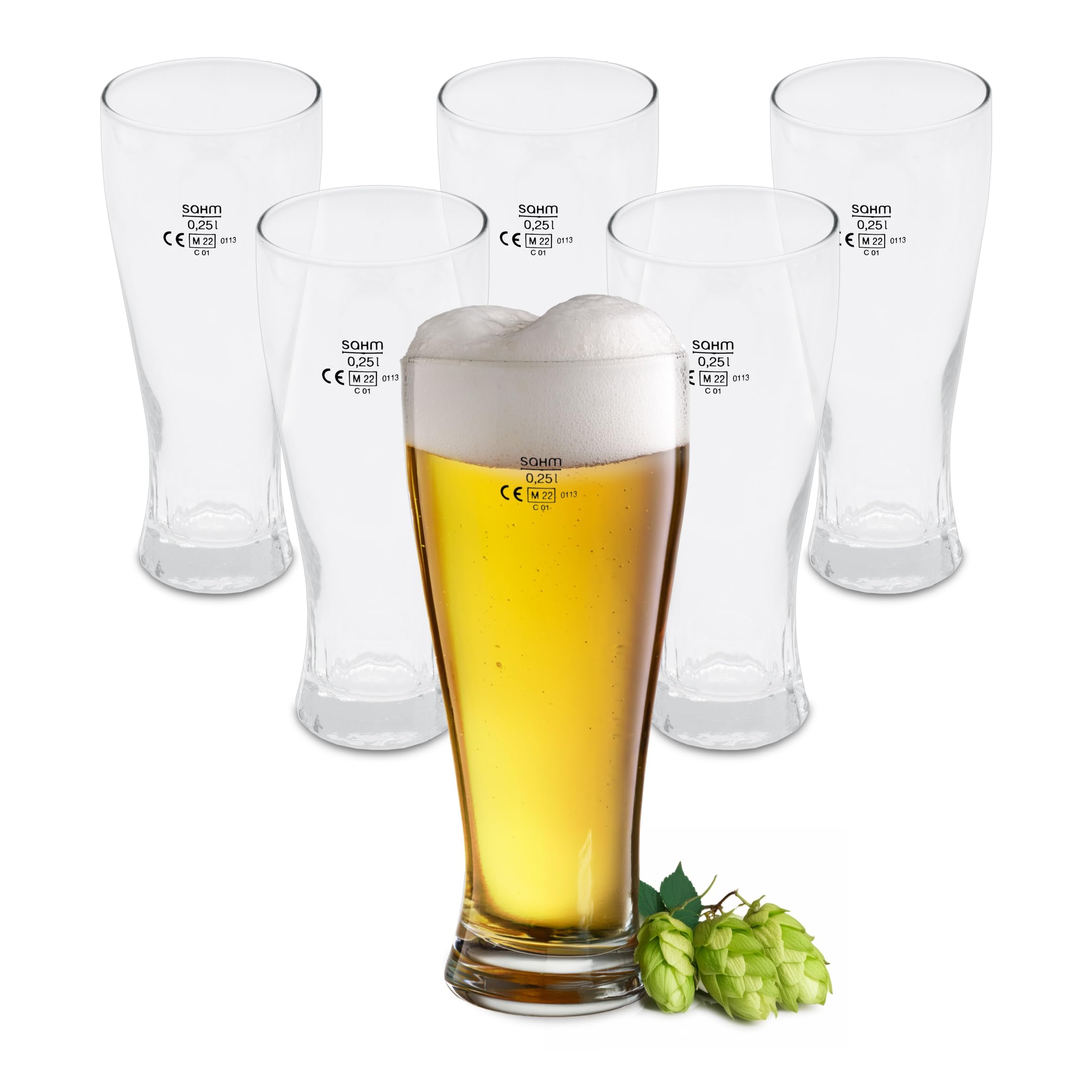 Prost! Mit diesen klassischen Biergläsern schmeckt das Bier gleich doppelt so gut. Im 6er-Set perfekt für die nächste Party oder den gemütlichen Abend mit Freunden. Jedes Glas fasst 0,25 Liter und hat einen Eichstrich - da weißt du immer, wie viel drin ist. Aus stabilem Klarglas, 17cm hoch und 7cm im Durchmesser. Super praktisch: spülmaschinenfest! Also nach der Party einfach in die Spülmaschine und fertig. Perfekt für Pilsner, Weizenbier, Weißbier oder Hefeweizen - jedes Bier schmeckt darin besser. Das klassische Design passt zu jedem Anlass. Also: Set bestellen und das nächste Bier in style genießen! Deine Gäste werden begeistert sein.