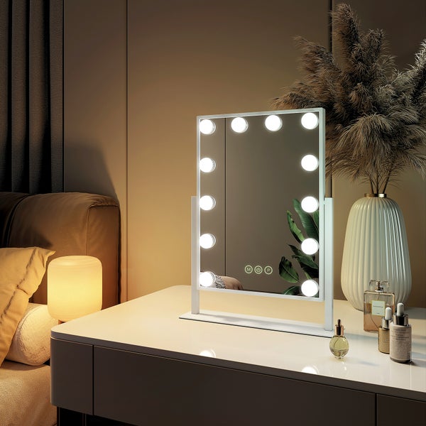 Hey Beauty-Fans! Dieser EMKE Hollywood-Spiegel ist ein absolutes Must-Have für deine Makeup-Routine. Mit 14 LED-Lampen und drei Lichtfarben (warmweiß, kaltweiß, neutral) findest du immer das perfekte Licht - egal ob für den Day-Look oder Abend-Makeup. Der Spiegel ist 60x52 cm groß und gibt dir damit einen super Blick auf dein gesamtes Gesicht. Das beste Feature: Er lässt sich um 360° drehen, sodass du jeden Winkel perfekt ausleuchten kannst. Inklusive 7-fach Vergrößerungsspiegel für präzises Arbeiten an Augenbrauen oder Lippenstift. Perfekt als Geschenk für Freundinnen, deine Frau oder Tochter zu Geburtstagen oder Weihnachten. Einfach einstecken und loslegen - der Spiegel merkt sich sogar deine letzte Einstellung! Ob für die tägliche Hautpflege oder besondere Anlässe - mit diesem Profi-Spiegel sitzt jedes Makeup. Übrigens: Die Helligkeit lässt sich stufenlos von 10% bis 100% regulieren. Ein echter Game-Changer für dein Badezimmer!