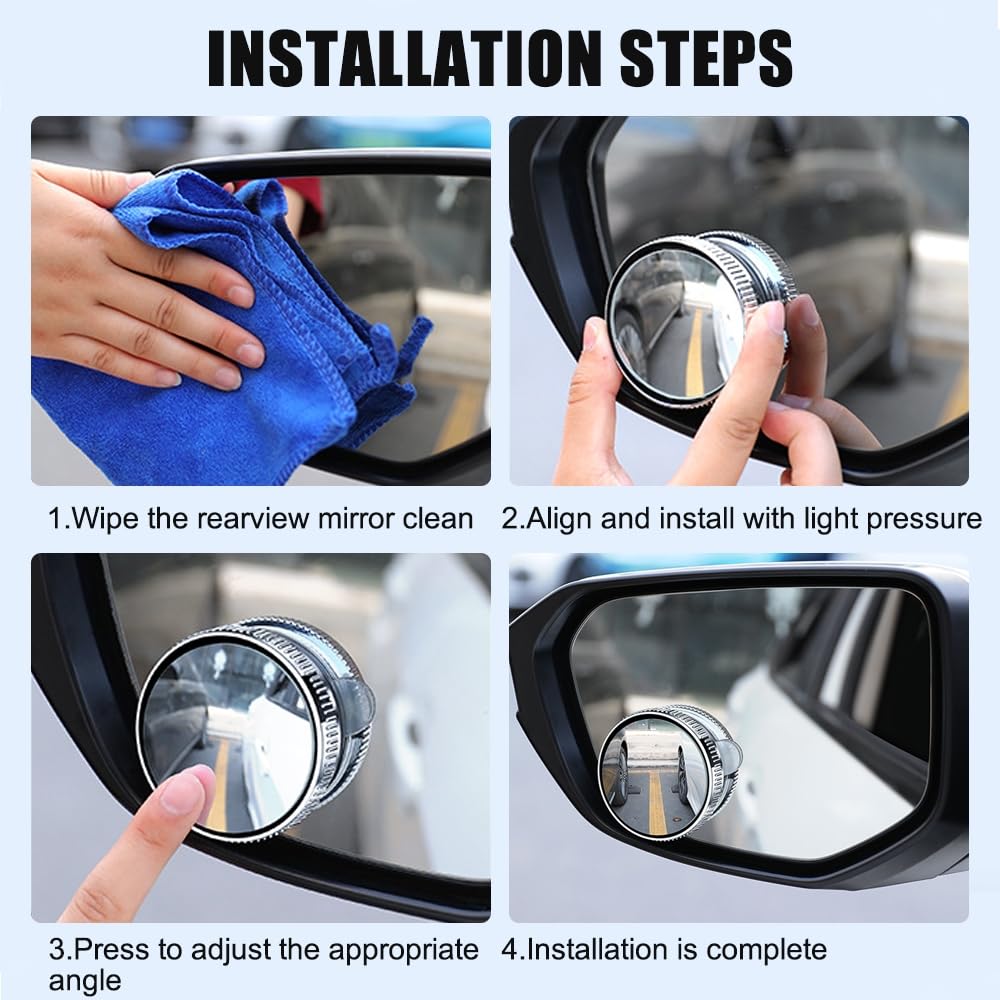 Mehr Sicherheit im Straßenverkehr! Dieses Set mit 2 toten Winkel Spiegeln hilft dir, blinde Flecken zu eliminieren. Mit 360° Drehfunktion und individueller Neigungseinstellung für den perfekten Blickwinkel. Die konvexe Form bietet ein erweitertes Sichtfeld - ideal beim Spurwechsel, Einparken oder Rückwärtsfahren. Einfache Montage ohne Werkzeug: Reinige den Außenspiegel, drück den Saugnapf fest und justiere den Spiegel. Rückstandslos entfernbar ohne Spuren zu hinterlassen! Hergestellt aus hochwertigem HD-Glas und robustem ABS-Kunststoff. Wasserdicht und wetterfest - hält bei jeder Witterung. Besonders praktisch für Fahranfänger, SUVs, Transporter oder ältere Fahrzeuge ohne moderne Assistenzsysteme. Silberne Farbe passt zu jedem Auto. Hol dir dieses günstige Sicherheits-Upgrade und fahre mit mehr Übersicht und Kontrolle! Einfach anbringen und von mehr Sicherheit profitieren.