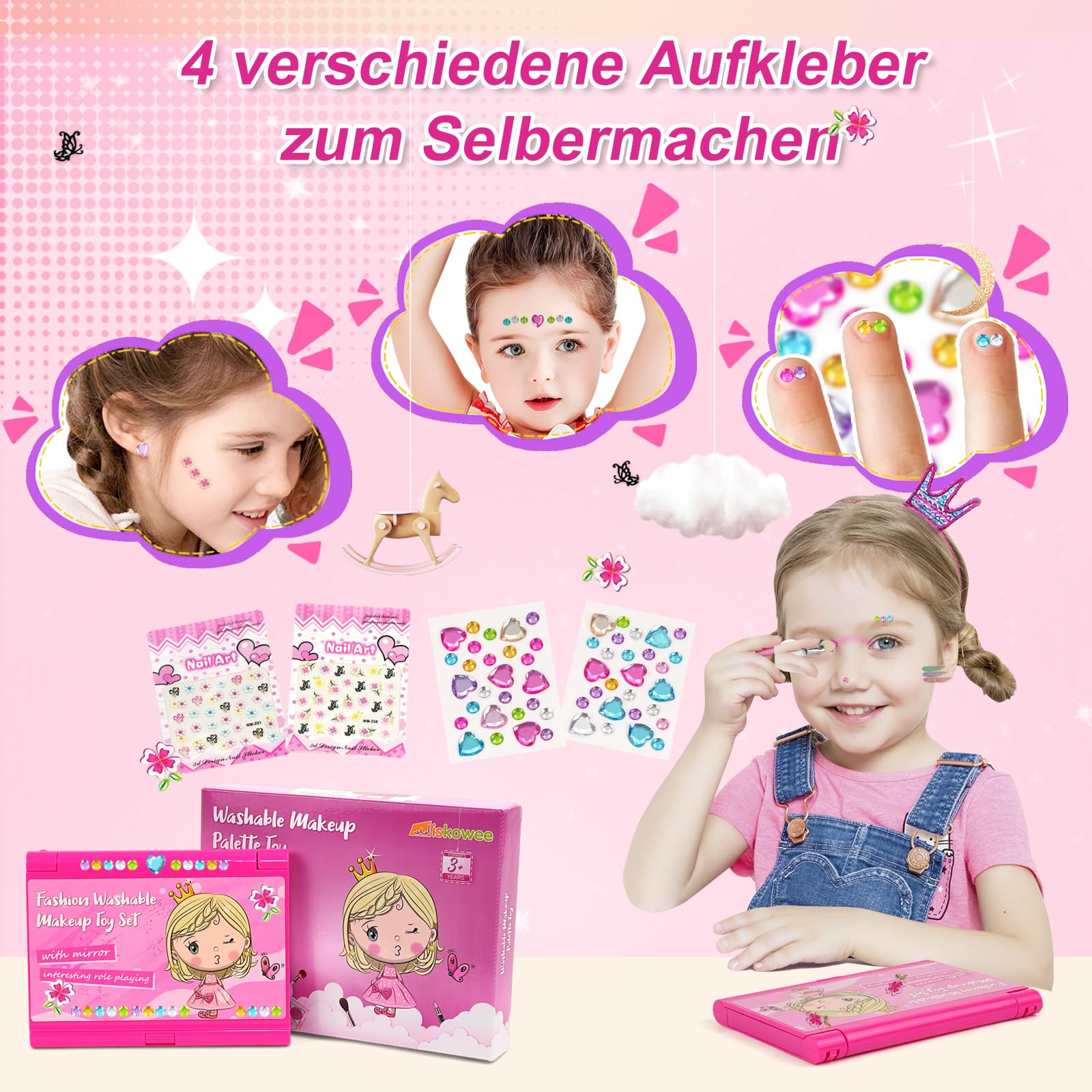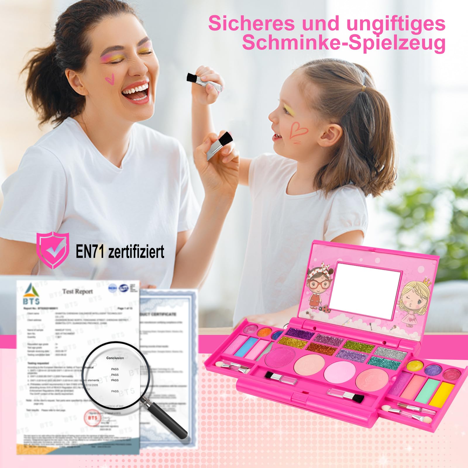 Deine kleine Prinzessin liebt es, sich zu schminken wie die Großen? Dieses 35-teilige Kinderschminke Set ist perfekt für erste Make-up-Versuche! Alles ist dabei: 2 Lippenstifte, 3 Nagellacke, verschiedene Lidschatten, Glitzerpuder, Rouge, Lipgloss und sogar 5 Make-up-Pinsel. Dazu kommen süße Accessoires wie Ohrringe, ein Ring und ein Kamm. Das Beste: Die Schminke ist speziell für Kinderhaut entwickelt - wasserlöslich, ungiftig und leicht abwaschbar. Keine Sorge also vor Flecken auf Haut oder Kleidung! Alles ist in einer praktischen Kosmetiktasche verpackt, die deine Tochter überall mitnehmen kann. Perfekt für Rollenspiele, Prinzessinnen-Partys, Karneval oder einfach für zu Hause. So kann sie spielerisch ihren eigenen Stil entdecken und fühlt sich wie eine echte Prinzessin. Ein super Geschenk für Mädchen zwischen 4 und 9 Jahren - ob zu Geburtstag, Weihnachten oder einfach so!
