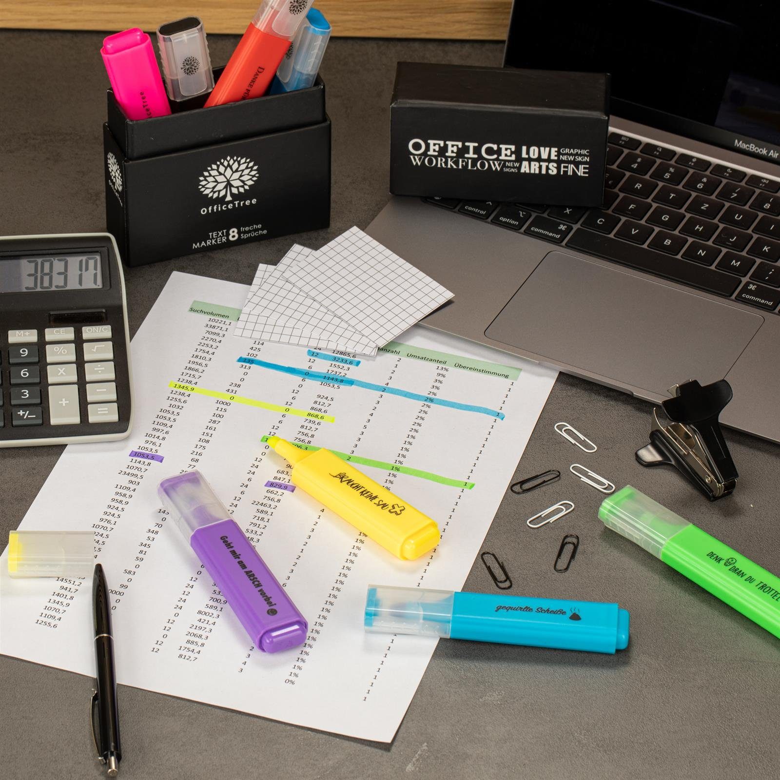 Hey Studenten, Lehrer und Büro-Menschen! Diese Textmarker bringen richtig gute Laune in deinen Alltag! Acht wunderschöne Pastellfarben, jeder mit einem lustigen oder motivierenden Spruch drauf. Perfekt zum Unterstreichen in Büchern, für Notizen, Bullet Journals oder kreative Projekte. Die wasserbasierte Tinte trocknet schnell, ist wischfest und gibt saubere, präzise Ergebnisse. Und die praktische Aufbewahrungsbox hält alles ordentlich zusammen - super für unterwegs! Egal ob in der Schule, Uni oder im Büro - mit diesen Markern macht das Lernen und Arbeiten gleich viel mehr Spaß! Auch als Geschenk ideal für Kollegen, Auszubildende, Schüler oder Lehrer. Zum Geburtstag, zum Start ins neue Schuljahr oder einfach mal so - diese Textmarker bringen immer ein Lächeln ins Gesicht! Hol sie dir und bring Farbe in deinen Alltag!