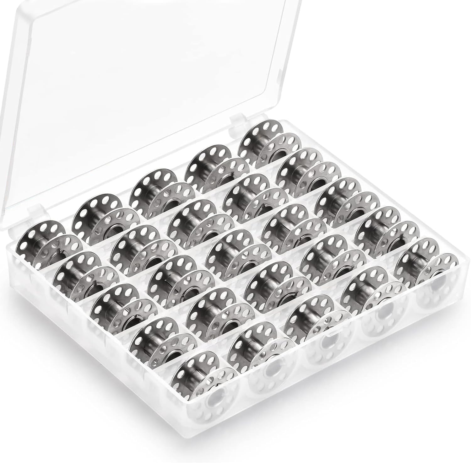Immer die passende Spule parat! Dieses Set mit 25 Edelstahl-Spulen ist perfekt für alle, die gerne nähen. Die Spulen (Durchmesser 2cm, Loch 0,5cm) passen in die meisten Haushaltsnähmaschinen (mit 5mm Spulenloch). Rostfrei, stabil und glatt – kein Fadenriss! Inklusive praktischer Kunststoff-Box zur Ordnung – so hast du alle Spulen griffbereit und sortiert. Ideal zum Wechseln der Farben oder als Ersatz. Super für Heimwerker, Schneider oder Hobby-Näher. Ein tolles Geschenk für kreative Köpfe! Mit diesem Set bist du für jedes Nähprojekt gerüstet – ohne langes Suchen.