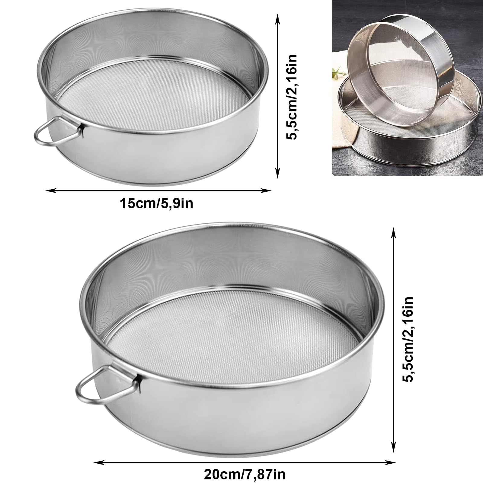 Perfektes Mehl für perfektes Backen! Dieses hochwertige Edelstahl-Sieb-Set von Yitobici macht dich zum Backprofi. Enthalten sind zwei Siebe in den Größen 15cm (40 Mesh) und 20cm (60 Mesh) - für jede Backaufgabe die richtige Wahl. Aus robustem 304 Edelstahl gefertigt, sind sie rostfrei und super langlebig. Die fein gewebten Siebe sorgen für klumpenfreies Mehl, Puderzucker oder Kakaopulver. Die 5,5cm hohen Ränder geben dir perfekten Halt beim Sieben - kein Verkanten, kein Verrutschen! Aber das ist noch nicht alles: Die Siebe eignen sich auch super zum Waschen von Obst, Gemüse, Reis oder Bohnen. Spülmaschinenfest und leicht zu reinigen - einfach unter fließendem Wasser abspülen. Ob für luftigen Kuchen, knuspriges Brot oder feine Desserts - mit diesen Sieben gelingt dir jedes Backwerk! Ein Muss für jede Hobby-Bäckerei!