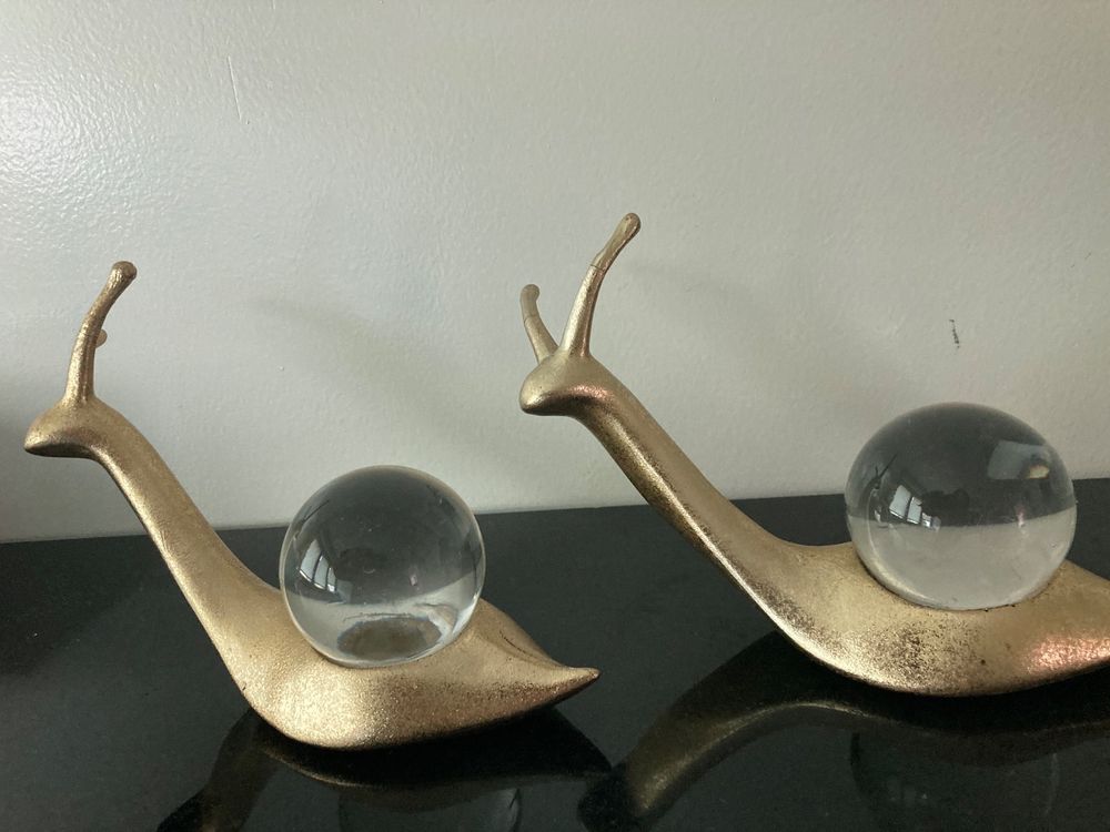 Diese niedlichen Messing-Schnecken bringen Charme in jedes Zuhause! Im 2er-Set mit verschiedenen Größen - 3,6x2x2,3cm und 4,3x3x2,2cm. Aus hochwertigem Messing in goldener Farbe gefertigt, sehen sie richtig edel aus. Im Retro-Stil designed, perfekt für den Schreibtisch, Wohnzimmer, Garten oder Büro. Super als Teepet oder einfach als dekoratives Highlight. Die Verarbeitung ist top - glatt, stabil und nicht leicht zu beschädigen. Von erfahrenen Handwerkern traditionell gefertigt, echtes Vintage-Feeling! Ob als Sammlerstück oder Geschenk - diese Schnecken machen immer was her.