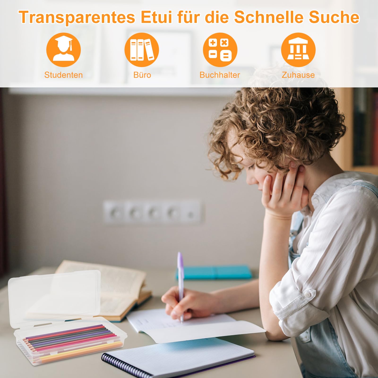 Boah, diese Stifteboxen von UOCAI sind einfach praktisch! Im Set kriegst du gleich 4 Stück - damit hast du alle deine Stifte und Kleinteile perfekt organisiert. Jede Box ist 19x9,5x3cm groß und aus robustem, transparentem Kunststoff.\n\nWas ich besonders cool finde: Die Boxen sind stapelbar! Durch die Rillen am Deckel kannst du sie stabil übereinander stapeln und sparst so richtig Platz. Perfekt also für den Schreibtisch, das Regal oder die Werkstatt.\n\nDer Deckel hat eine doppelte Schnalle - so springt er nicht einfach auf und deine ganzen kleinen Teile bleiben sicher drin. Und weil die Boxen transparent sind, siehst du sofort, was wo ist. Kein langes Suchen mehr!\n\nDu kannst damit nicht nur Stifte, Bleistifte und Buntstifte aufbewahren, sondern auch Perlen, Knöpfe, Münzen, Schmuck - eigentlich alles, was klein ist und gerne verloren geht. Egal ob für die Schule, das Büro oder zu Hause für Bastelarbeiten.\n\nDie Kanten sind alle glatt und nahtlos, also keine scharfen Ecken, an denen man sich schneiden kann. Und reinigen geht auch easy - einfach mit einem feuchten Lappen abwischen.\n\nAlso, wenn du endlich Ordnung in deine Schreibutensilien und Kleinteile bringen willst, sind diese Boxen genau das Richtige. Einfach bestellen, befüllen und dich über den aufgeräumten Arbeitsplatz freuen!