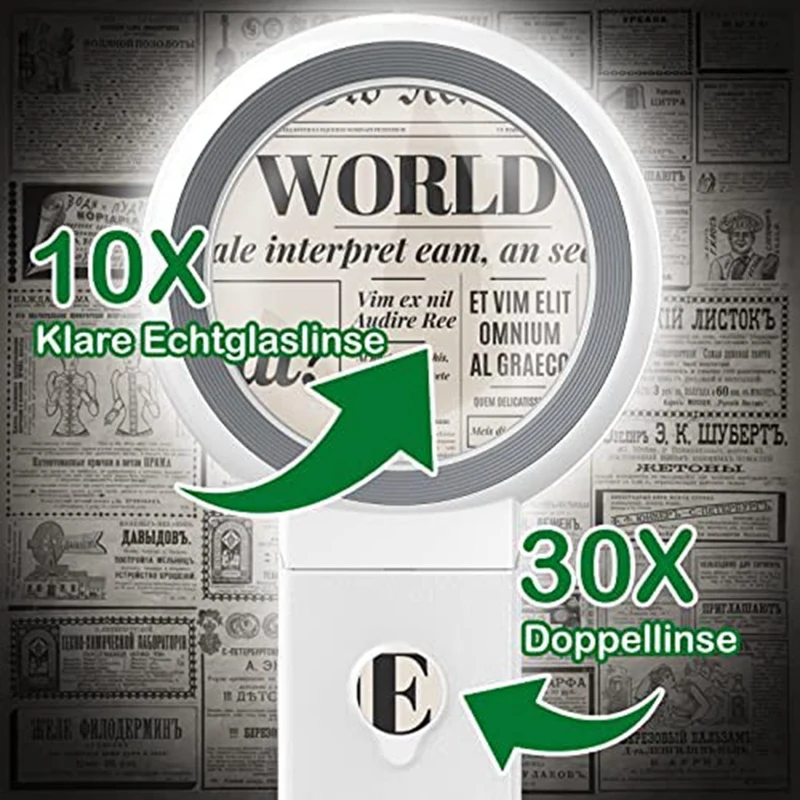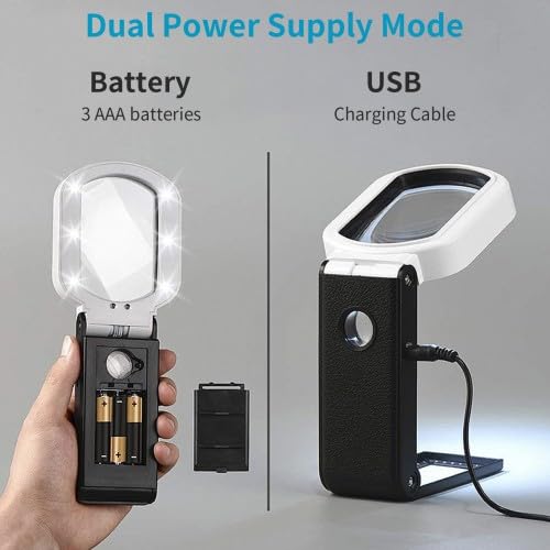 Endlich wieder klar sehen! Diese praktische Lupe mit LED-Beleuchtung macht das Lesen von kleingedruckten Texten zum Kinderspiel. Mit zwei Linsen: 10x für größere Bereiche, 25x für winzige Details. Der klappbare Ständer ermöglicht freihändiges Arbeiten - super beim Lesen, Nähen oder bei Reparaturen. 9 LED-Lichter sorgen für perfekte Ausleuchtung. Betrieb mit 3 AAA-Batterien (nicht im Lieferumfang) oder per USB-Kabel. Perfekt für Senioren, Briefmarkensammler, Modellbauer oder für die Uhrenreparatur. Die 21,8cm große Lupe ist handlich und trotzdem leistungsstark. Ein echter Helfer für alle, die öfter mal was vergrößern müssen!