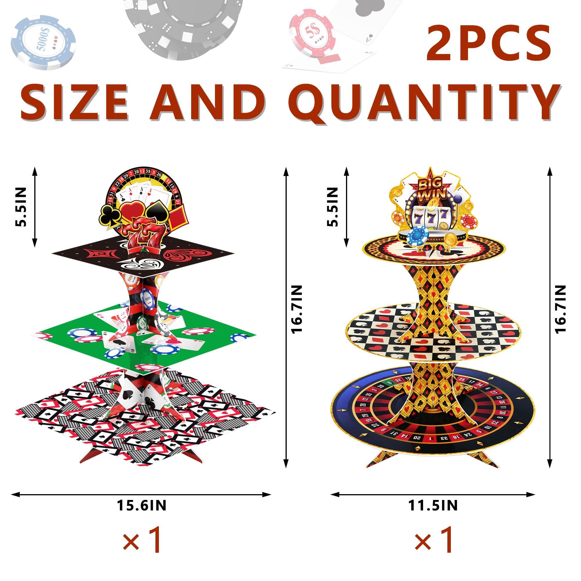 All-In für deine Casino-Party! Dieser 3-stöckige Cupcake-Ständer im Poker-Design ist der absolute Hingucker. Mit Würfel-, Poker- und Casino-Motiven verleiht er deiner Feier das echte Las-Vegas-Feeling. Hält bis zu 24 Cupcakes und ist ruckzuck zusammengebaut. Aus stabilem Karton gefertigt, aber dennoch robust. Maße: 39,1 cm hoch, mit Durchmessern von 16 cm (oben), 23,1 cm (Mitte) und 30 cm (unten). Perfekt für Geburtstage, Pokerabende oder jede Casino-Mottoparty!