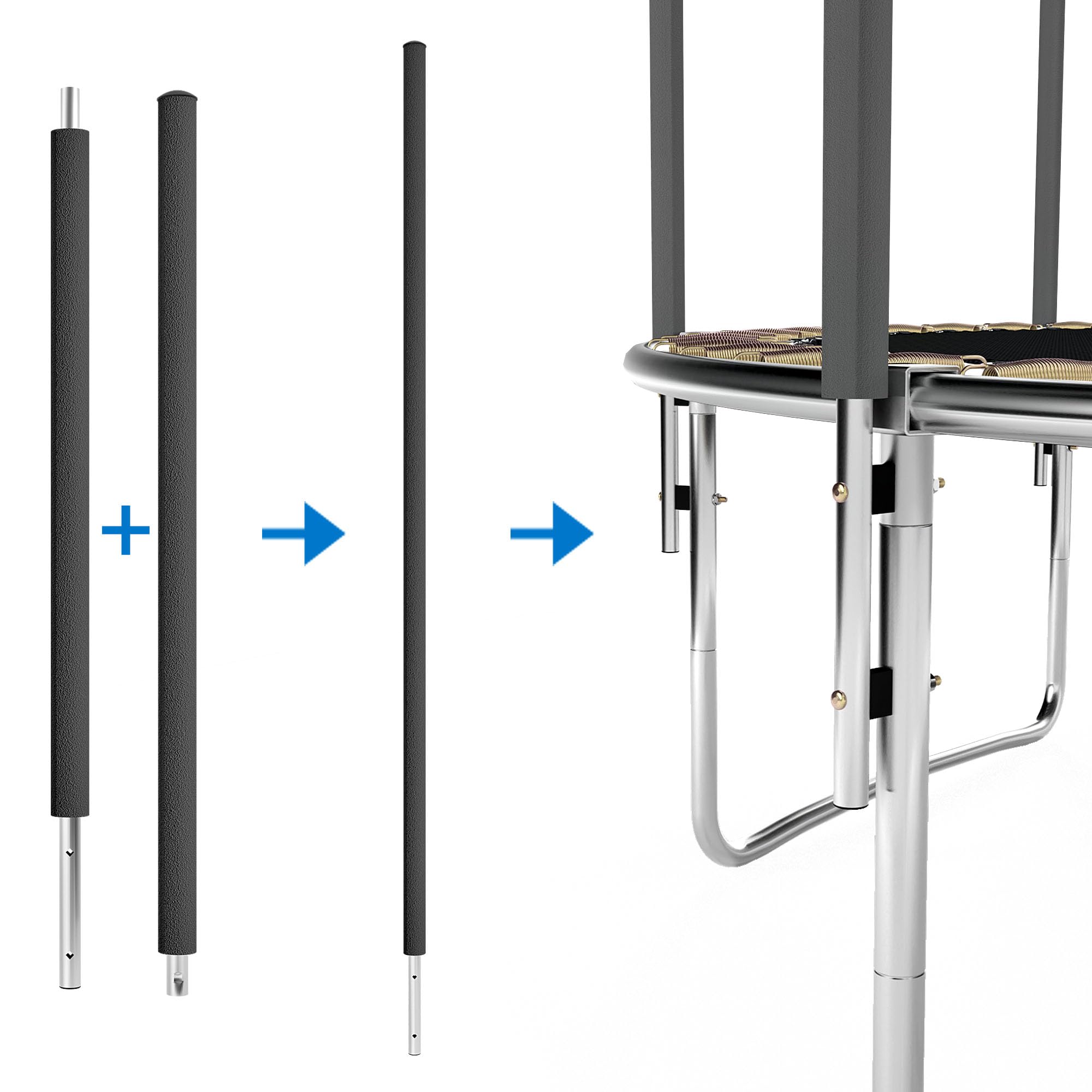 Pass auf: Diese Trampolin-Stangen machen dein Garten-Trampolin sicherer! Aus stabilem Stahl gefertigt und mit dicker PE-Schaumstoffhülle ummantelt. Die Stangen sind wasserfest, UV-beständig und verformen sich nicht - selbst bei wildem Springen. \\n\\nDas coole Blau sieht nicht nur gut aus, sondern warnt auch vor den Stangen. Die Montage ist denkbar einfach: Die 4 Teile einfach zusammenstecken (wahlweise 1,76m oder 1,96m Gesamtlänge) und am Trampolin befestigen. Kompatibel mit den meisten 6-16ft Trampolinen. \\n\\nBesonders praktisch: Die Stangen verhindern lästige Kollisionen beim Springen. Deine Kinder sind besser geschützt - und du musst dir weniger Sorgen machen. Perfekt für den Dauereinsatz im Garten, ob bei Sonne oder Regen. \\n\\nDank des durchdachten Designs sparst du dir teure Neuanschaffungen. Einfach die alten, kaputten Stangen ersetzen und schon ist dein Trampolin wieder top in Schuss! Die robuste Verarbeitung garantiert dir lange Freude an den Stangen. Ein echter Sicherheits-Upgrade für jedes Trampolin!