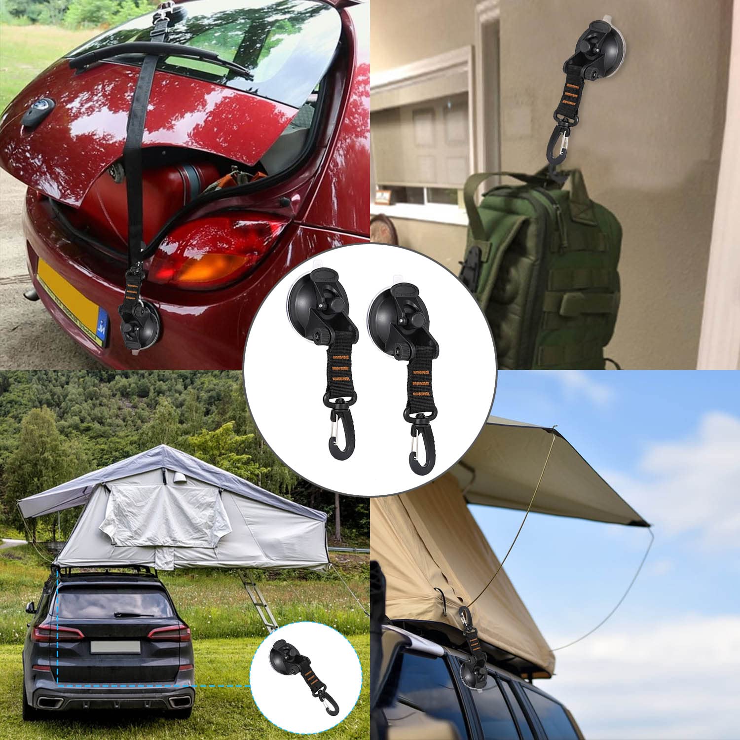 Die Saugnäpfe sind wetterfest und haben ein Vakuum-System für extra starken Halt. Perfekt für: Planen befestigen, Zelte verankern, Sonnenschutz anbringen oder deine Haustiere im Auto sichern. Und weil sie so leicht und kompakt sind, nimmst du sie einfach überall mit hin.