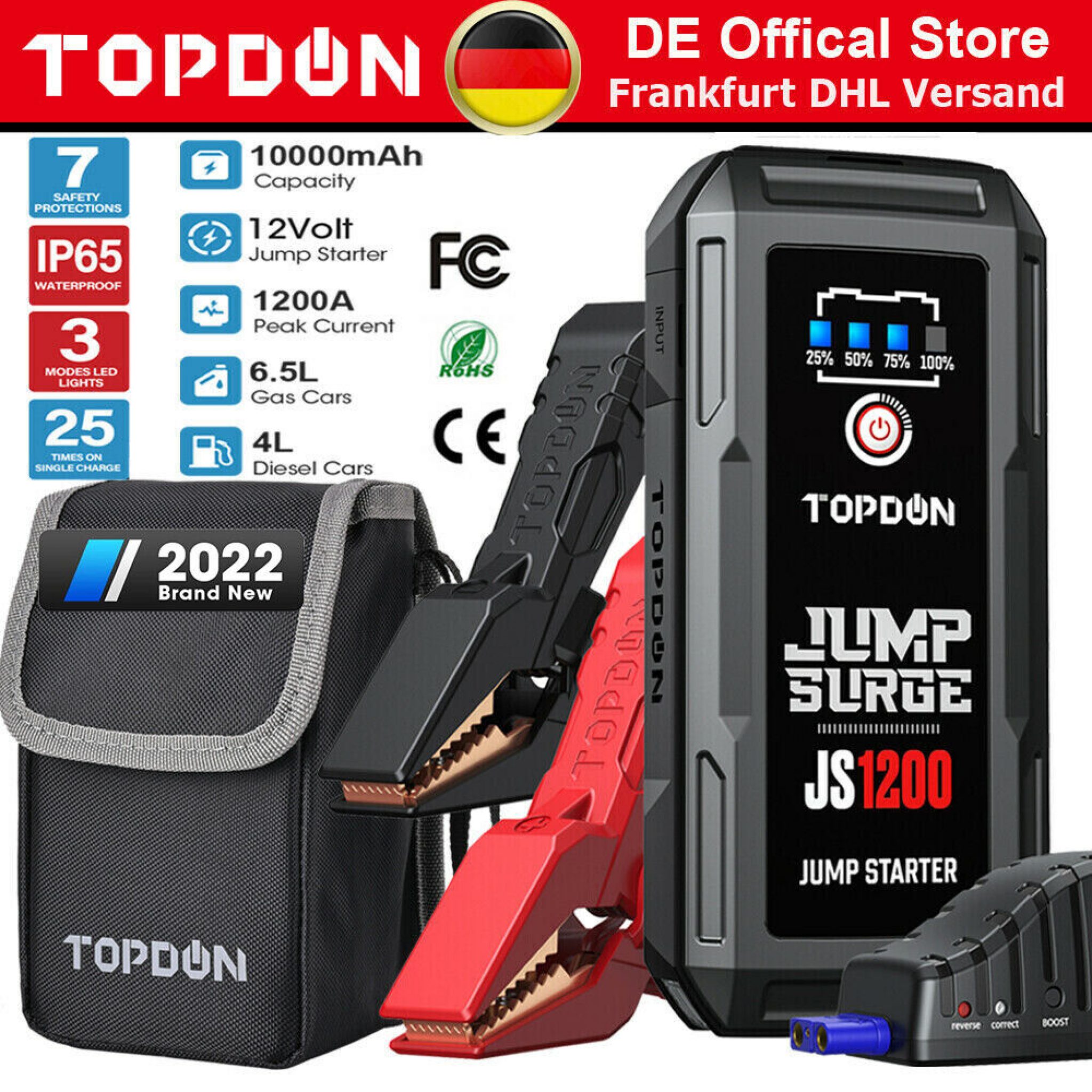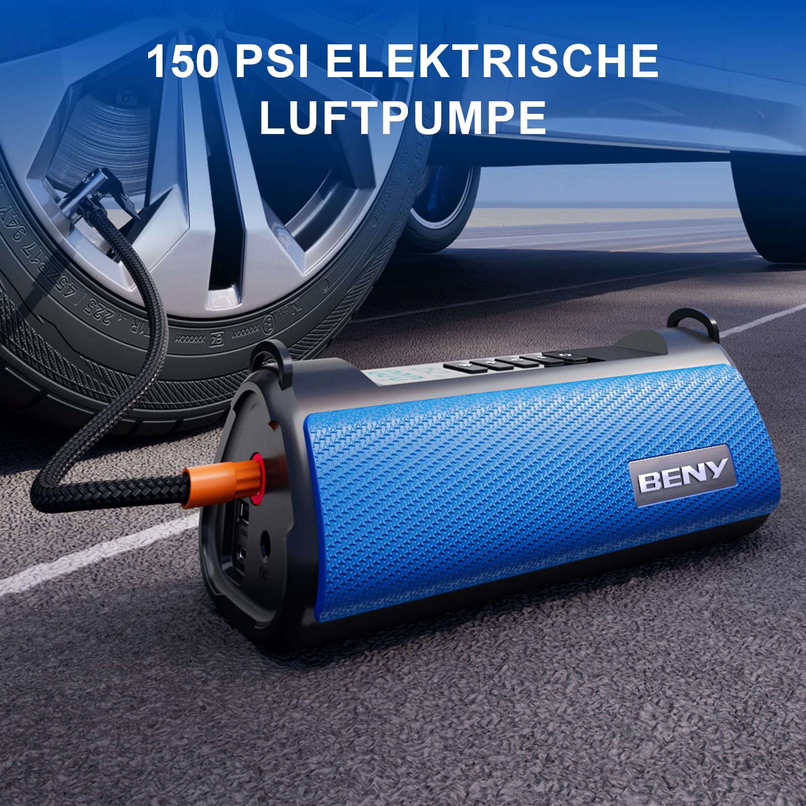 Pannenhilfe in einer Box! Diese EAFC Starthilfe Powerbank hat alles was du brauchst: 1200A Spitzenstrom für Benzinmotoren bis 4,0L und Diesel bis 2,0L. Integrierter 150PSI Kompressor für Reifen - mit 5 Füllmodi für Auto, Motorrad, Fahrrad, Bälle und individuell. 20000mAh Kapazität - lädt auch dein Handy oder Tablet. LED-Taschenlampe mit 3 Modi: Dauerlicht, SOS, Blitzlicht. Hält Temperaturen von -20°C bis +60°C aus - perfekt für Winter und Sommer. Intelligente Sicherheitsklemmen mit Alarm. Wichtig: Erst aufladen (mindestens 4 Stunden) bevor du startest! Im Lieferumfang: Starthilfegerät, 3 Gasdüsen, Luftschlauch, 12V-Kabel, USB-C-Ladekabel, Tasche, Anleitung. Nie wieder hilflos mit leerer Batterie dastehen!