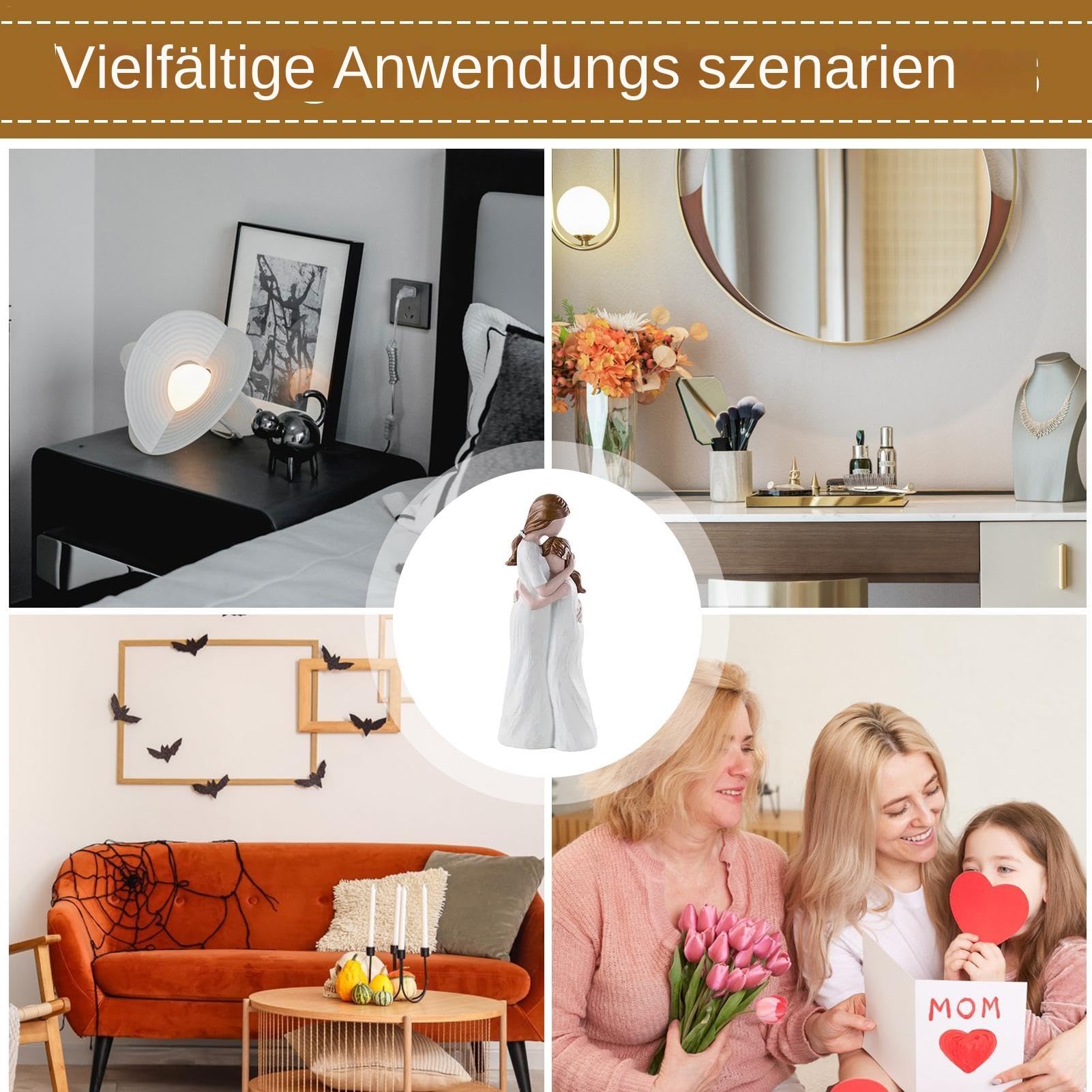 Diese wunderschöne Mutter-Tochter-Statue zeigt die zarte Umarmung zwischen Mutter und Kind - ein Symbol purer Liebe und Verbundenheit. Aus hochwertigem Harz gefertigt, ist sie besonders langlebig und verblasst nicht. Die feine Verarbeitung und das detailreiche Design machen sie zu einem echten Hingucker. Perfekt fürs Wohnzimmer, Schlafzimmer, Regal oder Nachttisch. Verleiht jedem Raum eine warme, gemütliche Atmosphäre. Ein ideales Geschenk für Geburtstage, Muttertag oder einfach so - um die besondere Bindung zwischen Mutter und Tochter zu feiern. Diese bezaubernde Figur erinnert täglich an die wichtigste Beziehung im Leben. Hol sie dir und bringe mehr Herzlichkeit in dein Zuhause!