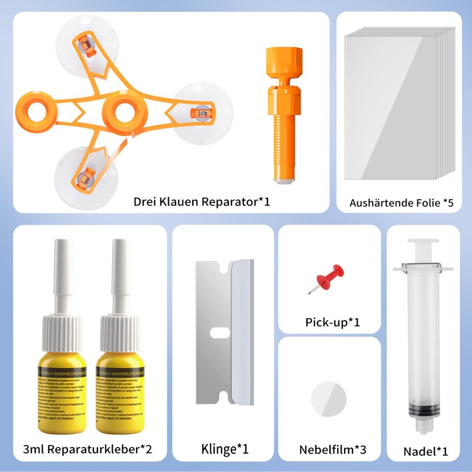 Autofahrer aufgepasst! Dieses Steinschlag-Reparaturset rettet deine Windschutzscheibe vor teuren Reparaturen. Enthält 2 Flaschen Reparaturflüssigkeit, 5 Aushärtungsfolien und 1 Rakel - alles was du brauchst! Perfekt für kleine Steinschläge, Risse bis 30cm und runde Schäden bis 2,5cm Durchmesser. Einfache Anwendung: Reinigen, Flüssigkeit auftragen, 10-20 Minuten in der Sonne trocknen lassen und überschüssiges Material abziehen. Die Nano-Flüssigkeit dringt tief in die Risse ein und härtet kristallklar aus. Klein und leicht - passt in jedes Handschuhfach. Nie wieder teure Werkstattbesuche für kleine Steinschläge! Wichtig: Nicht für Handy-Displays geeignet. Hol dir dieses Set und repariere Steinschläge selbst - schnell, einfach und kostengünstig!