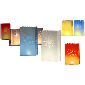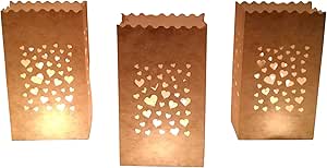 Wow, was für ein magisches Set! 36 weiße Lichttüten mit 7 verschiedenen Motiven: Herzen, Sterne, Monde, Sonnen, Doppelherzen, Feuerwerk und Schmetterlinge. Jede Tüte ist 26x15x9cm groß.