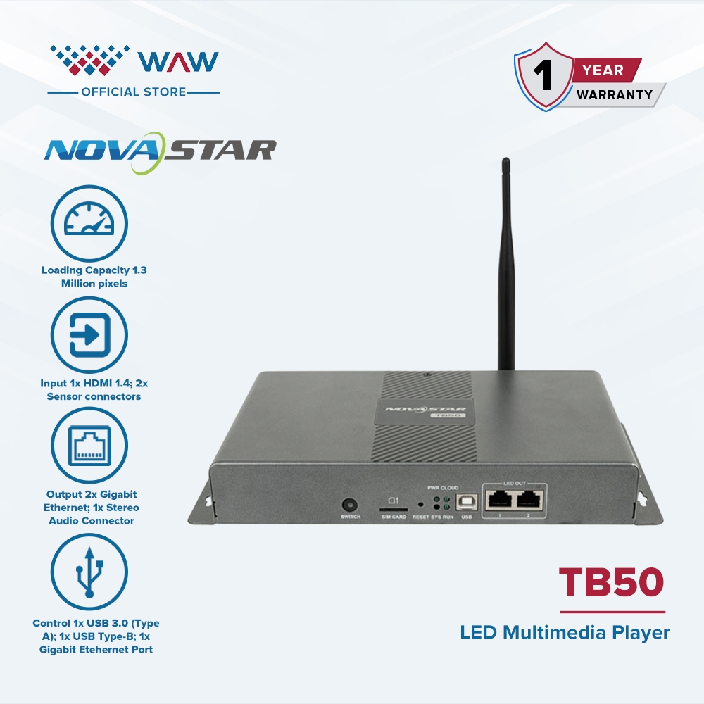 Professionelle LED-Steuerung gesucht? Die NovaStar TB50 ist das Upgrade der TB6 und macht richtig was her! Perfekt für große LED-Displays, kannst du damit Inhalte von PC, Handy oder Tablet aus steuern. Cloud-fähig - verwalte deine Displays von überall auf der Welt. Unterstützt synchrone Wiedergabe auf mehreren Screens und läuft im synchronen und asynchronen Modus. Braucht nur 18W Leistung und hält Temperaturen von -40°C bis +80°C aus. Wiegt 1,25kg - handlich aber robust. Ideal für Werbedisplays, Events oder Messen. Einfach anschließen und über die Cloud-Plattform loslegen - moderne Display-Steuerung vom Feinsten!
