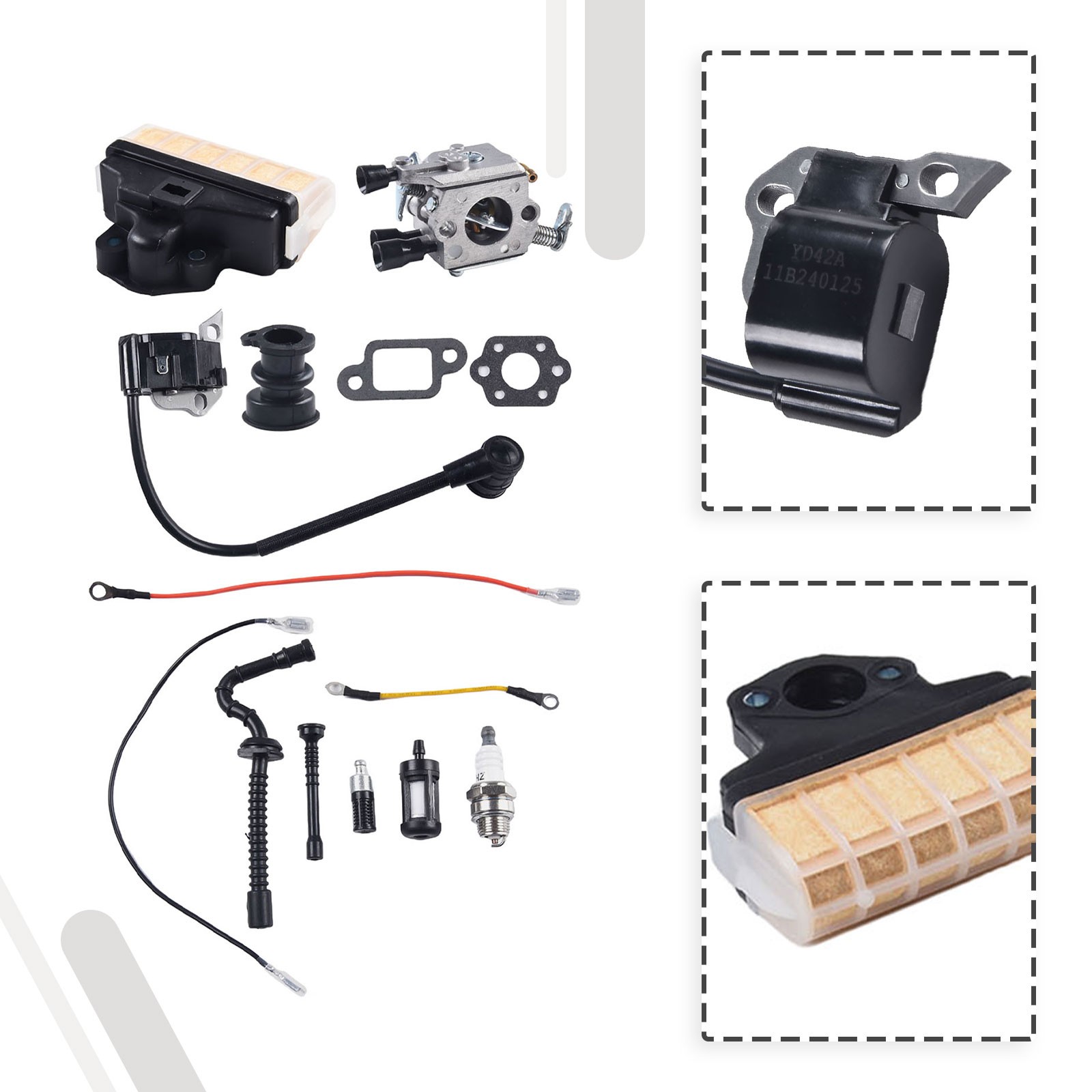 Alles in einem Set für deine Stihl Motorsäge! Dieses Komplett-Vergaser-Set passt für 021, 023, 025, MS210, MS230, MS250 Modelle. Enthält: Vergaser, Kraftstofffilter, Zündkerze, Öltankdeckel, Luftfilter, Kraftstoffleitung, Dichtungen und Gummischläuche. Alles originalgetreu nach OE-Nummer 1123-120-0605. Aus hitzebeständigen Materialien für lange Lebensdauer. Einfach zu montieren - alle Teile passen perfekt. Damit machst du deine Säge schnell wieder fit, ohne lange nach Einzelteilen suchen zu müssen. Einfach bestellen, einbauen und wieder durchstarten im Wald!