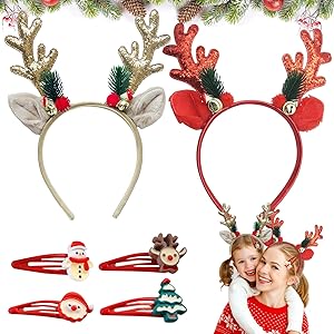 Diese süßen Weihnachts-Stirnbänder bringen sofort Festtagsstimmung! Im Set sind 2 Hirschgeweih-Stirnbänder und 2 passende Haarspangen enthalten - also genug für die ganze Familie oder für verschiedene Looks. Die Geweihe sind aus weichem Samt und Stoff, sitzen angenehm auf dem Kopf und drücken nicht. Mit den flexiblen Clips halten sie sicher in den Haaren. Perfekt für Weihnachtsfeiern, Karneval, Fotoshootings oder einfach um daheim in Weihnachtsstimmung zu kommen. Ob für Kinder oder Erwachsene - diese Accessoires machen jedem Spaß und sind ein tolles Geschenk unterm Christbaum!