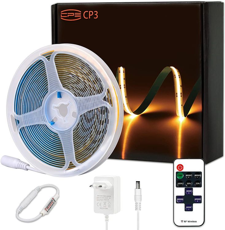 Traumhaft schönes Licht mit diesem COB LED Streifen! 5 Meter lang in warmweiß 3000K - perfekt für gemütliche Atmosphäre. Mit 2400 Chips für super gleichmäßiges Licht ohne dunkle Stellen. Dimmbar von 5-100% per RF-Fernbedienung - inklusive Timer und Memory-Funktion! IP44 spritzwassergeschützt - ideal für Küche, Bad oder Außenbereich. Einfach zu installieren mit 3M Klebeband, alle 5cm schneidbar. 24V Betrieb für mehr Sicherheit, inklusive Netzteil. CRI90+ für natürliche Farbwiedergabe. Perfekt für Regale, Schränke, Treppen oder als indirekte Beleuchtung. Mach dein Zuhause zur Wohlfühloase! Hol dir diesen hochwertigen LED-Streifen und genieße perfektes Licht! Einfach ankleben und entspannen - deine Räume werden verwandelt!