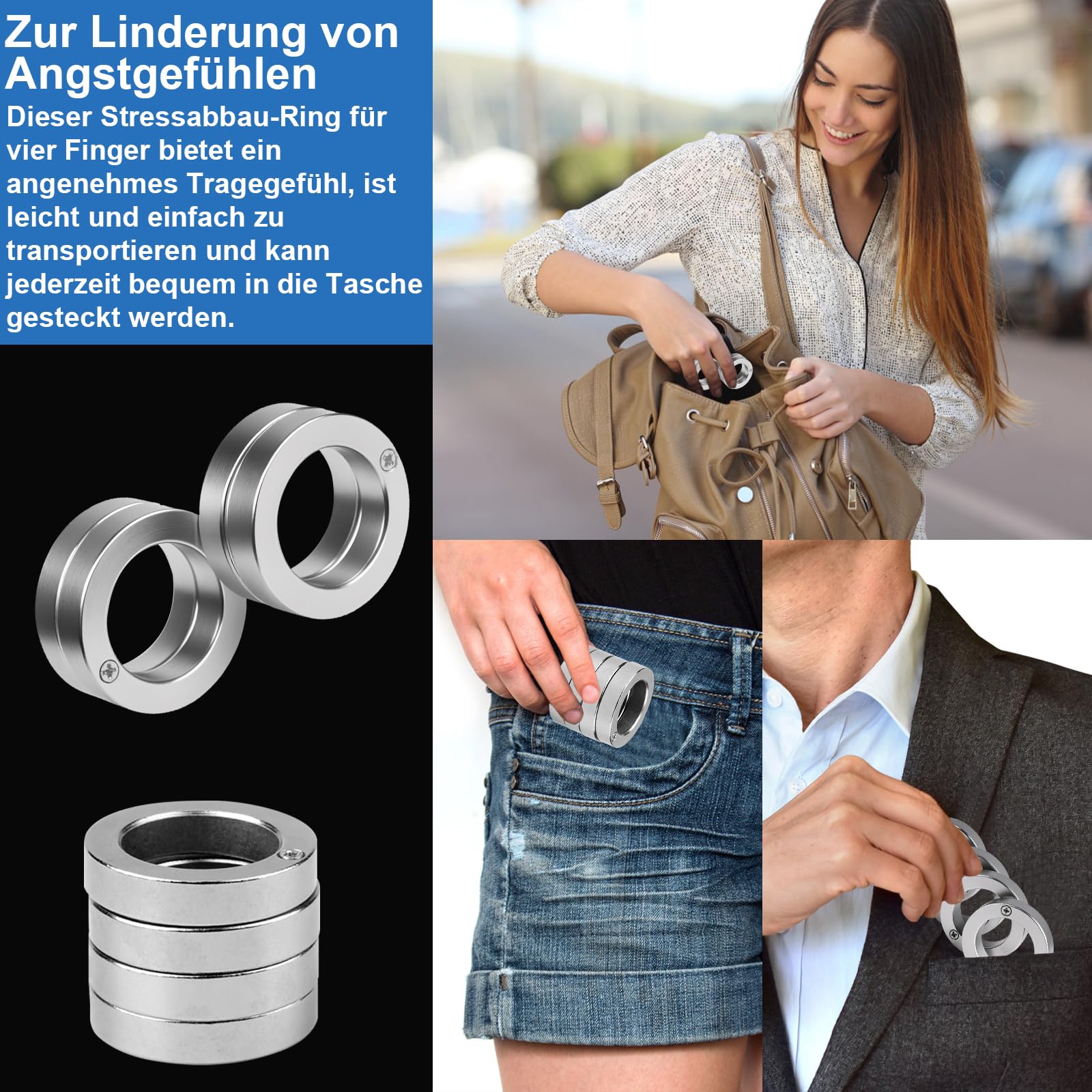 Dieser coole faltbare Ring aus Titanstahl ist dein neuer Stresskiller! Mit 16 Ringen im Set kannst du ihn an fast jedem Finger tragen. Einfach falten und drehen - die glatten Nieten sorgen für reibungslose Bewegung. Super leise, also perfekt für Büro, Schule oder unterwegs. Passt in jede Tasche und ist immer griffbereit wenn die Nerven blank liegen. Besonders praktisch: Der Ring kann im Notfall auch als Glasbrecher verwendet werden! Mit 11,5 cm Größe in silber. Hilft bei Konzentration und Angstabbau - nicht nur für ADHS. Ein stylisches Accessoire mit echtem Mehrwert!
