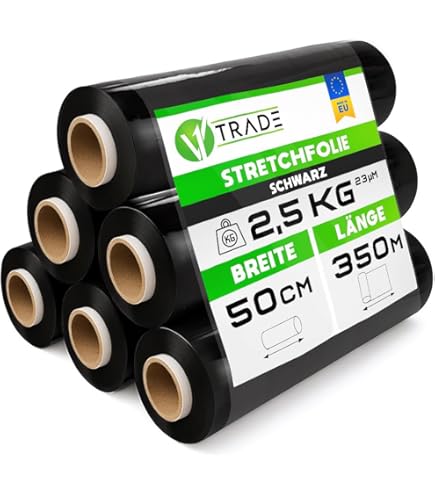 Verpacken war noch nie so einfach! Diese kräftige schwarze Stretchfolie ist der absolute Allrounder für Lager, Umzug oder Versand. Jede der 6 Rollen bringt stolze 2,5kg auf die Waage bei 500mm Breite und einer Stärke von 23my. Das 5-lagige LLDPE-Material ist einfach unkaputtbar - reißfest, durchstoßsicher und dehnt sich bis zu 180%! Die einseitige Klebeschicht verhindert, dass mehrere Packstücke zusammenkleben, und die wasserabweisende Oberfläche schützt deine Ware zuverlässig vor Witterungseinflüssen. Perfekt zum Sichern von Palettenladungen, Verpacken von Sperrgut oder für den nächsten Umzug. Und das Beste: Die Folie kommt direkt vom deutschen Hersteller aus Weiden - da weißt du, was du kriegst! Kein Billigimport, sondern echte Markenqualität. Die Rollen laufen superleise ab und passen sich jeder Produktform an, ohne etwas zu beschädigen. Ob im gewerblichen Bereich oder für den privaten Umzug - diese Stretchfolie macht einfach alles mit. Bei Bestellung bis 14 Uhr geht's meist noch am selben Tag raus! Einfach abrollen, umwickeln und dich über bombensicheren Transport freuen!