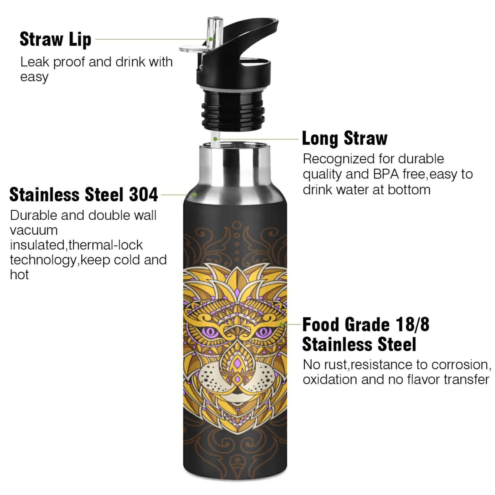 Diese coole Löwen-Trinkflasche ist der ideale Begleiter für unterwegs! Aus doppelwandigem Edelstahl hält sie deine Getränke bis zu 12 Stunden warm und 24 Stunden kalt. Mit dem praktischen Strohhalm kannst du easy trinken - aber Vorsicht, keine heißen Getränke darüber, sonst verbrennst du dir den Mund! Die Flasche ist komplett BPA-frei und auslaufsicher, also perfekt für die Schule, Sport oder Ausflüge. Die große Öffnung macht das Befüllen mit Eiswürfeln zum Kinderspiel, und der breite Griff liegt super in der Hand. Wähle zwischen 30oz und 40oz - je nachdem, wie viel du trinken möchtest. Das königliche Design gefällt nicht nur Kindern, sondern auch Erwachsenen. Ein tolles Geschenk für Geburtstage, Weihnachten oder einfach so!