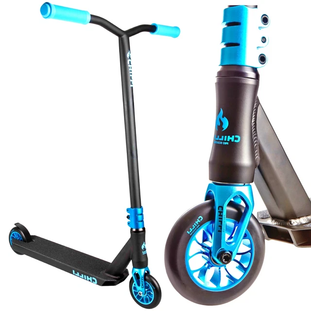 Ready for some serious scooter action! Der Chilli Pro Reaper ist ein professioneller Stunt-Scooter, der für Tricks und Street-Style gemacht ist. Mit 84cm Gesamthöhe und robusten Komponenten hält er auch den härtesten Landungen stand.\\n\\nTechnische Spezifikationen:\\n• Gesamthöhe: 84 cm (vom Boden gemessen)\\n• T-Bar: 4130 CrMo Stahl, 58x58 cm\\n• Deck: 6061 Aluminium, 50x11,5 cm\\n• Räder: 110mm mit ABEC 9 Lagern\\n• Gewicht: 3,8 kg bei max. 100kg Belastung\\n\\nKomplettausstattung:\\n• Chilli Pro Reaper Scooter\\n• Chilli XL T-Bar aus Stahl\\n• 110mm Spoke Wheels\\n• ABEC 9 Lager für schnelles Rollen\\n• Fantic26 Team Griptape\\n• Integriertes Headset\\n• Topmount Flex Brake\\n\\nWarum dieser Scooter rockt:\\n• Perfekt für Tricks und Stunts\\n• Robuste Verarbeitung für lange Haltbarkeit\\n• Optimale Größe für Jugendliche und Erwachsene\\n• Leicht genug für hohe Sprünge\\n• Cooles Design mit Limited Edition Sticker\\n\\nDie ideale Lenkerhöhe liegt auf Hüfthöhe und sollte nicht über Bauchnabelhöhe gehen. So hast du die perfekte Kontrolle für deine Tricks.\\n\\nGeeignet für:\\n• Scooter-Anfänger ab 8 Jahren\\n• Fortgeschrittene und Profis\\n• Street und Park Riding\\n• Tricks und Stunts\\n• Freizeit und Sport\\n\\nMit dem Chilli Pro Reaper bist du bereit für den Skatepark, die Street oder einfach nur für coole Cruises durch die Stadt. Ein echter Hingucker mit professioneller Performance!