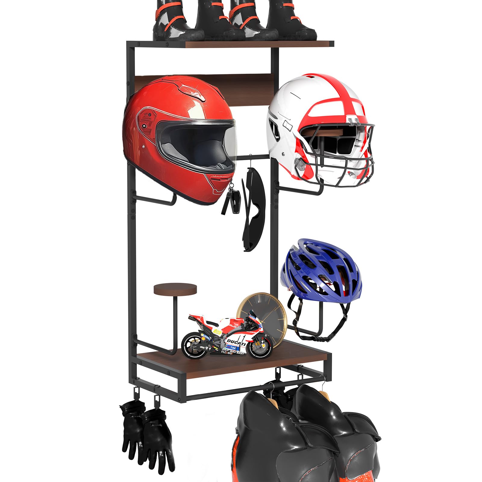 Endlich Ordnung im Schrank oder an der Wand! Dieser massive Helmhalter aus rohem Holz sieht nicht nur cool aus, sondern hält auch richtig was aus. Bis zu 40 kg trägt das Teil - da kannst du getrost deine komplette Motorradausrüstung, taktische Westen oder auch deinen Fußballkram unterbringen.