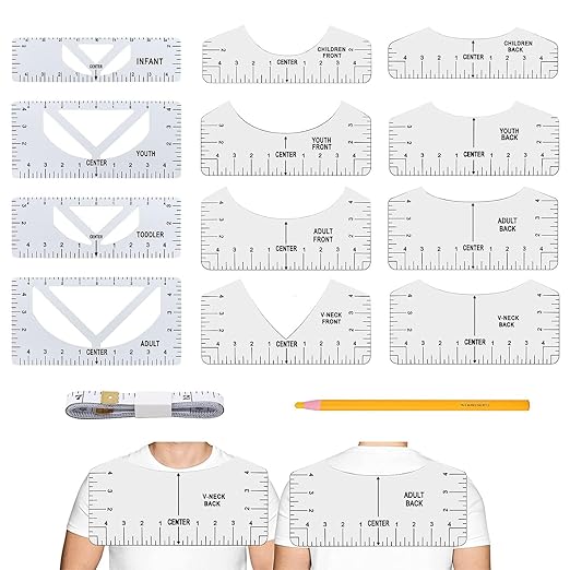 Perfekte T-Shirt-Drucke jedes Mal! Dieses 8-teilige Lineal-Set hilft dir, Motive und Texte genau an der richtigen Stelle zu platzieren. Aus hochwertigem PVC-Material mit glatten Kanten - verletzt nicht die Hände und ist langlebig. Verschiedene Größen für alle T-Shirt-Größen von Kinder bis Erwachsene. Einfach aufs T-Shirt legen, Position anpassen und losdrucken. Kein kompliziertes Messen nötig - spart Zeit und Nerven. Ideal für Hobby-Drucker, Schulen oder kleine Businesses. Inklusive Maßband für zusätzliche Präzision. Mach deine DIY-T-Shirts professionell!