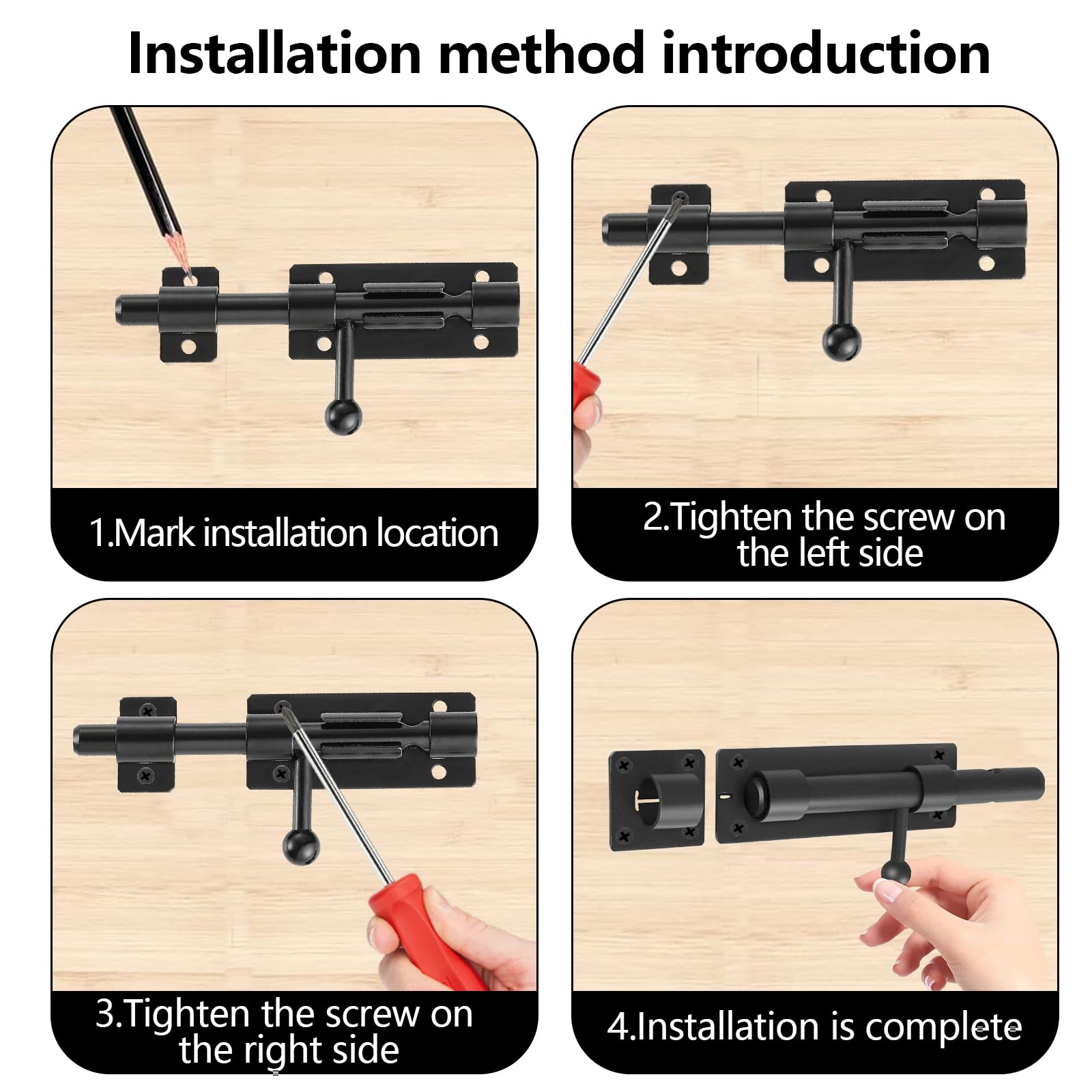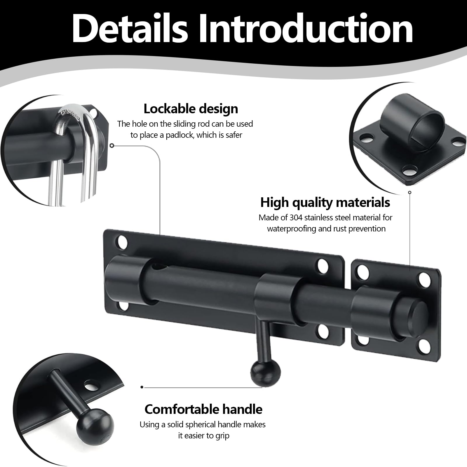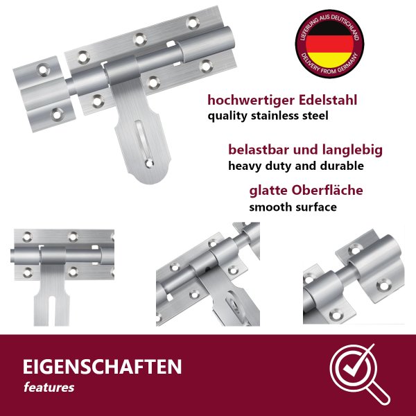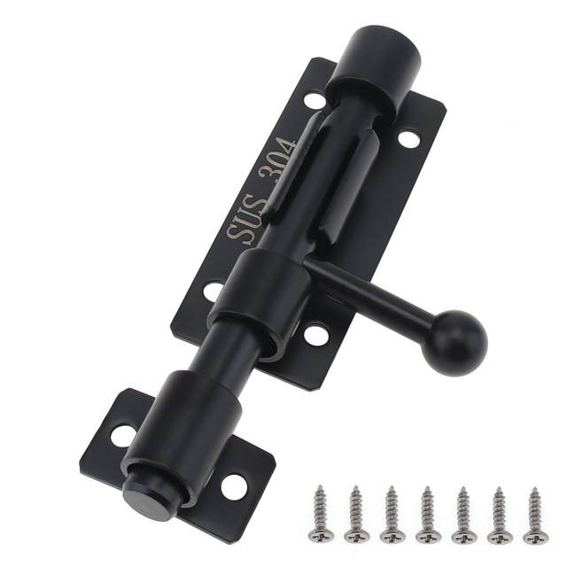 Für mehr Sicherheit an Türen und Toren! Diese zwei robusten Riegel aus 304er Edelstahl rostfrei halten alles sicher verschlossen.\\n\\nBesonderes Feature: Das Loch in der Schiebestange für ein Vorhängeschloss - doppelter Schutz! Verdickter Griff für extra Stabilität.\\n\\nEinfache Montage: Mit den 12 mitgelieferten Schrauben fixieren - fertig. Abgeflachte Bolzen und Löcher für perfekten Sitz.\\n\\nIdeal für: Garagentore, Hoftore, Kellertüren, Gartenhäuser, Hundezwinger. Maße: 4 Zoll (ca. 10 cm). Schwarz beschichtet - sieht clean aus und rostet nicht. Mach dein Zuhause sicherer!