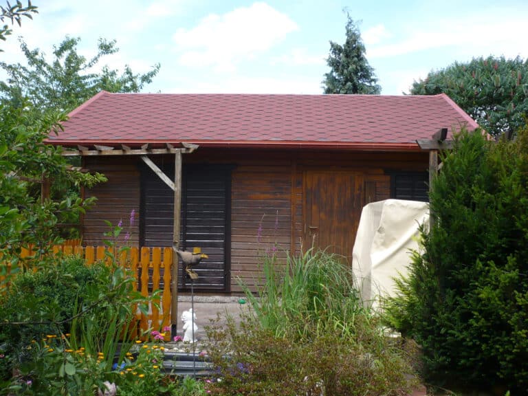 Macht das Dach eures Gartenhauses richtig schön und wetterfest! Dieses TIMBELA Set enthält alles, was ihr für die Dacheindeckung braucht: Ausreichend Bitumenschindeln für ca. 9m² Dachfläche, Dachfirstteile und Nägel. Die Schindeln in Hexagonal-Form und kräftigem Rot sind aus hochwertigem, mit Glasfaser verstärktem Bitumen. Extrem witterungsbeständig, kein Ausbleichen, unempfindlich gegen Fäulnis und Korrosion. Einfach zu verlegen - auch für Heimwerker gut machbar. Lieferung erfolgt in mehreren Kartons. Das Dach hält dann jahrelang dicht und sieht super aus!