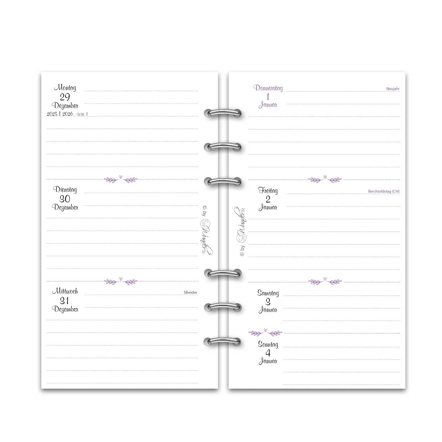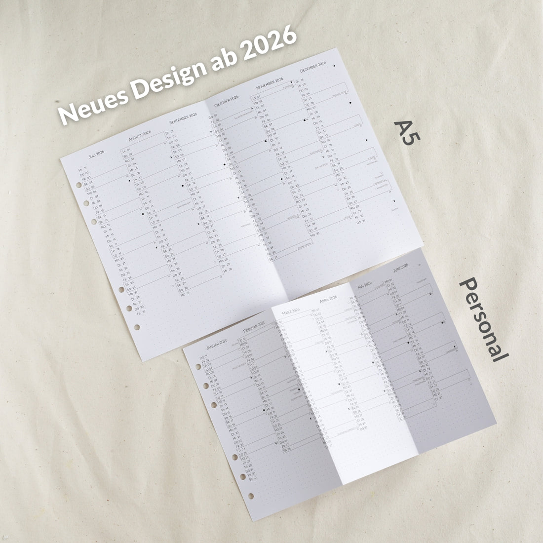 Planen war noch nie so schön! Diese premium Kalendereinlagen von SinnWunder für 2026 bringen Ordnung in dein Leben - und das mit Stil. Im praktischen Personal-Format (9,6 x 17,2 cm) mit der typischen 6-Ring-Lochung passen sie perfekt in deinen Filofax und viele andere Ringbücher. Auf 212 Seiten hast du je 2 Tage pro Seite plus Platz für Notizen - ideal für alle, die gerne detailliert planen. Das unbeschichtete Naturpapier mit 100 g/m² ist ein Traum zum Beschreiben! Ob mit Füller, Fineliner oder für Handlettering - nichts drückt durch. Dazu gibt's Monatsübersichten, Feiertage für Deutschland, Österreich und Schweiz, und extra Notizseiten. Hergestellt in Deutschland in plastikfreier Verpackung. Perfekt kombiniert mit den anderen SinnWunder Produkten für dein perfektes Kalender-Setup. Endlich ein Kalender, der nicht nur praktisch ist, sondern auch richtig gut aussieht!