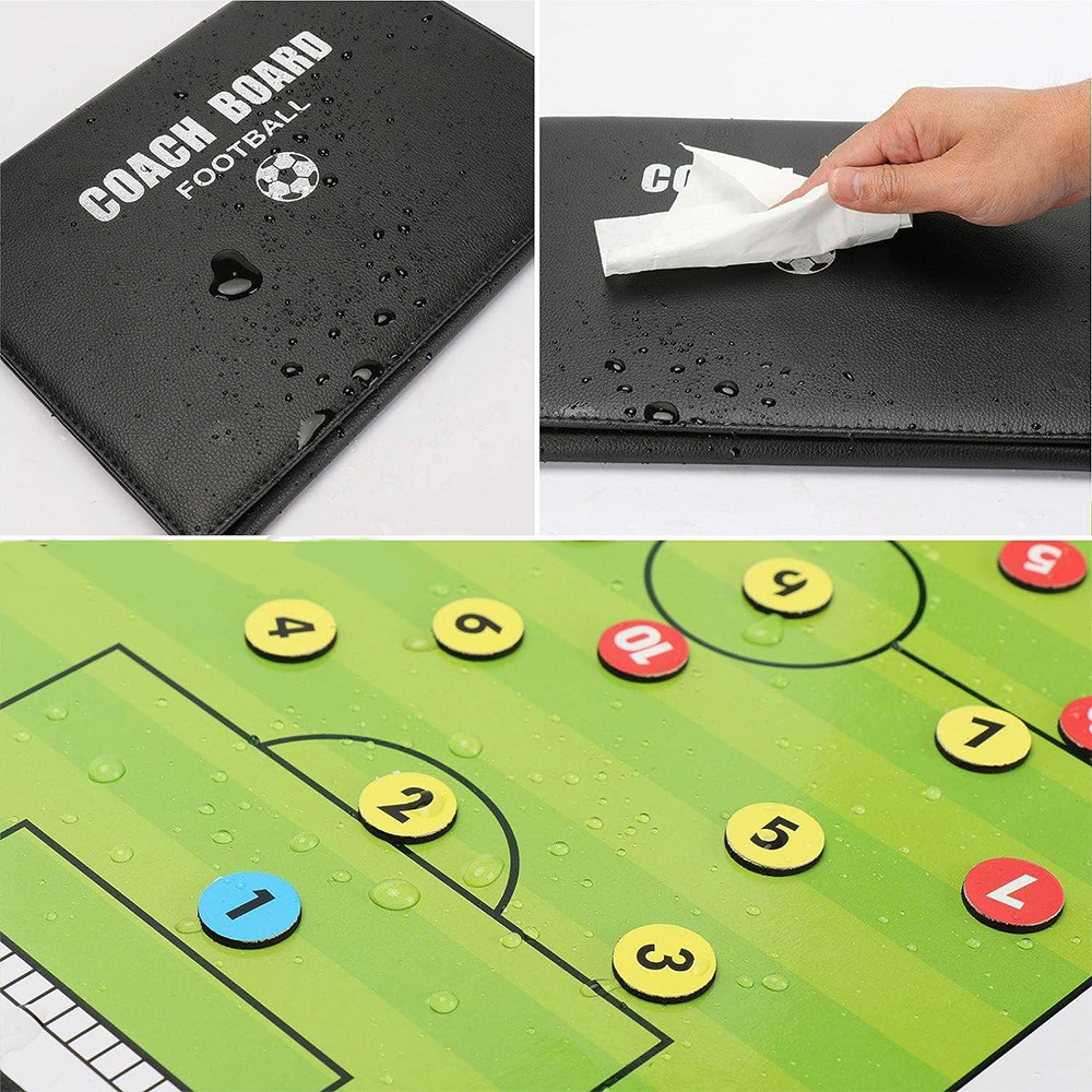 Der perfekte Begleiter für jeden Fußballtrainer! Diese professionelle Trainermappe aus hochwertigem Leder ist wasserdicht und extrem langlebig. Im praktischen Format (28,5x20x3cm gefaltet) passt sie in jede Trainertasche. Das Set enthält alles für taktische Anweisungen: 24 magnetische Schachfiguren, die sicher auf der Tafel haften, eine Trockenlöschtafel mit Marker, elektronischen Timer, Pfeife, rot-gelbe Karten und Radiergummi. Die starken Magnete halten die Figuren auch beim Kippen der Tafel sicher in Position. Der Timer mit AG13-Batterie bietet präzise Zeitmessung, während die Standard-Karten (10,5x12cm) sofort erkennbar sind. Einfach aufklappen, Formationen markieren und deinem Team taktische Anweisungen geben - ob am Spielfeldrand, in der Kabine oder während des Trainings. Perfekt für Jugendtrainer, Amateurligen oder Profi-Coaches. Mit Reißverschluss sicher verschlossen und immer griffbereit. Das ideale Geschenk für jeden Fußball-Begeisterten!