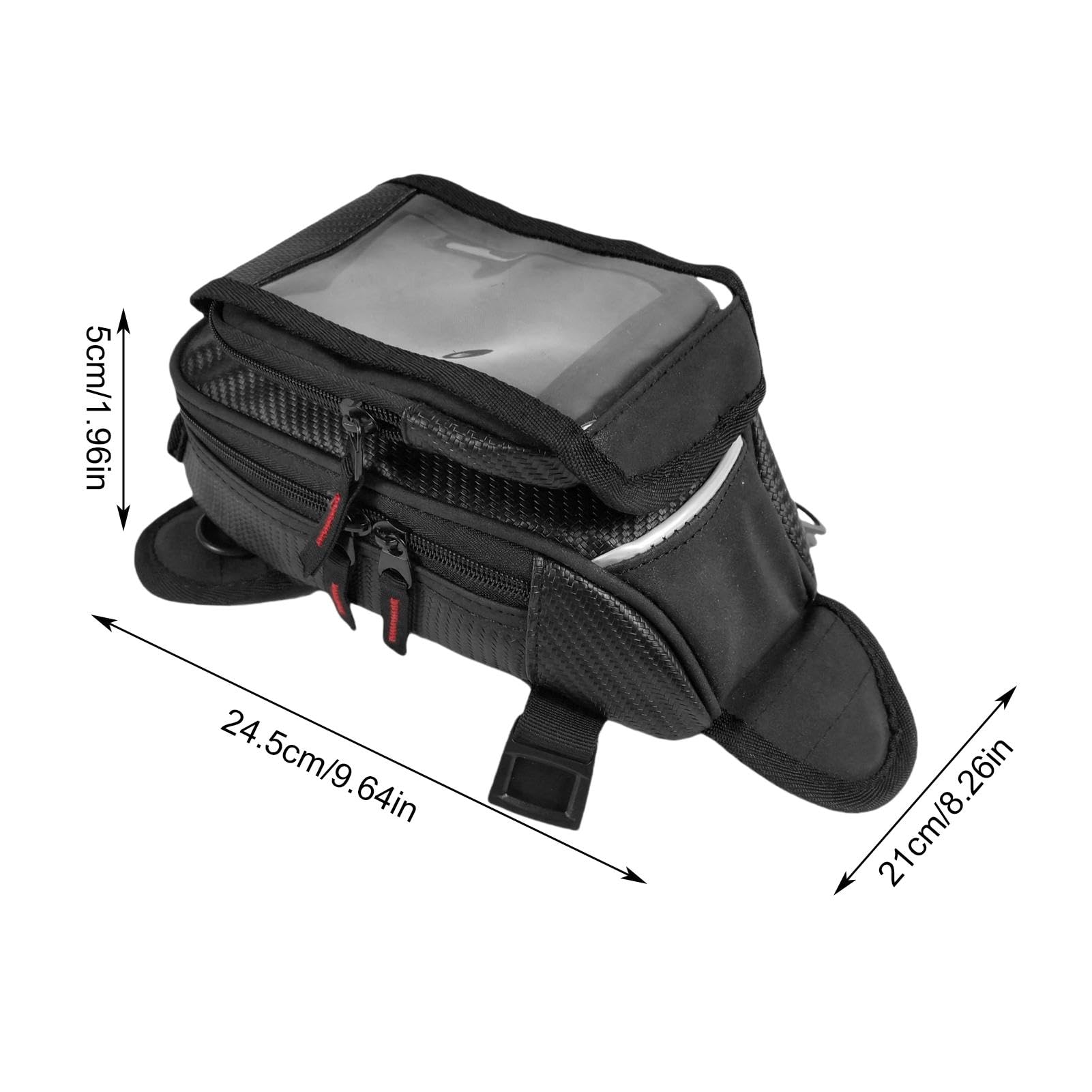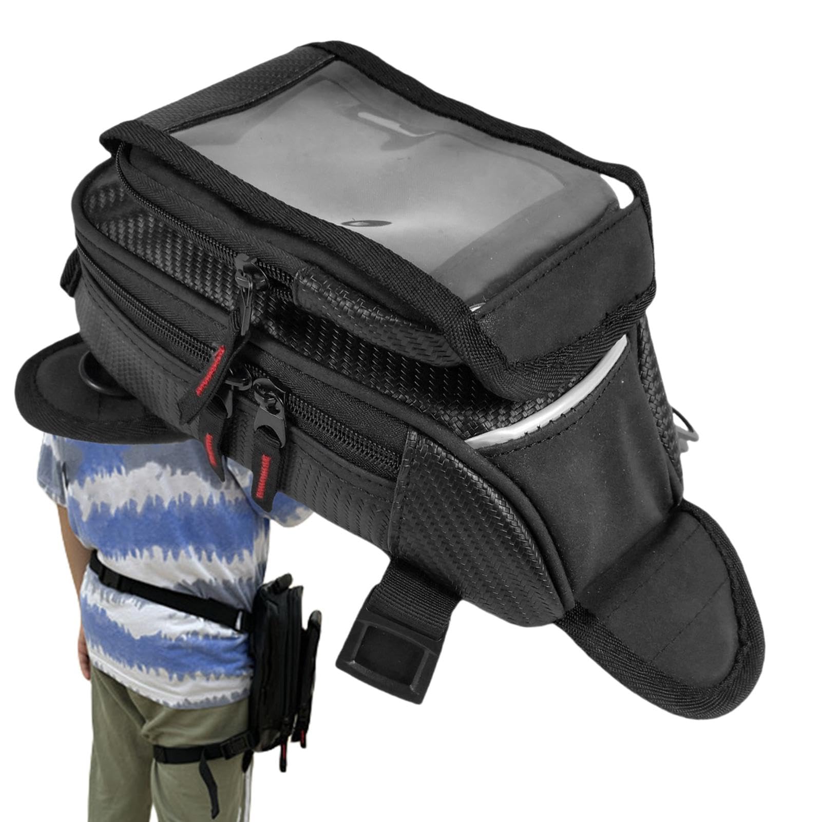 Perfekt für alle Motorrad-Fans! Dieser magnetische Tankrucksack ist dein zuverlässiger Begleiter auf jeder Tour. Die starken Magnete halten bombenfest - selbst auf holprigen Straßen verrutscht nichts. Das coole Feature: Die transparente Vordertasche für dein Smartphone ermöglicht Touchscreen-Navigation bei jedem Wetter. Komplett wasserdicht, also kein Problem bei Regen. Mit verstellbarem Schultergurt wird der Rucksack zur praktischen Umhängetasche. Der Zwei-Wege-Reißverschluss gibt einfachen Zugang zu deinen Sachen. Aus Carbonfaser-Leder, nur 370 Gramm leicht und ca. 24,5 x 21 x 5 cm groß. Perfekt für die meisten Motorrad-Modelle. Ob Handy, Geldbeutel oder Snacks - alles bleibt sicher und trocken. Einfach auf den Tank schnallen und los geht's! Praktischer geht's kaum - probier's aus!