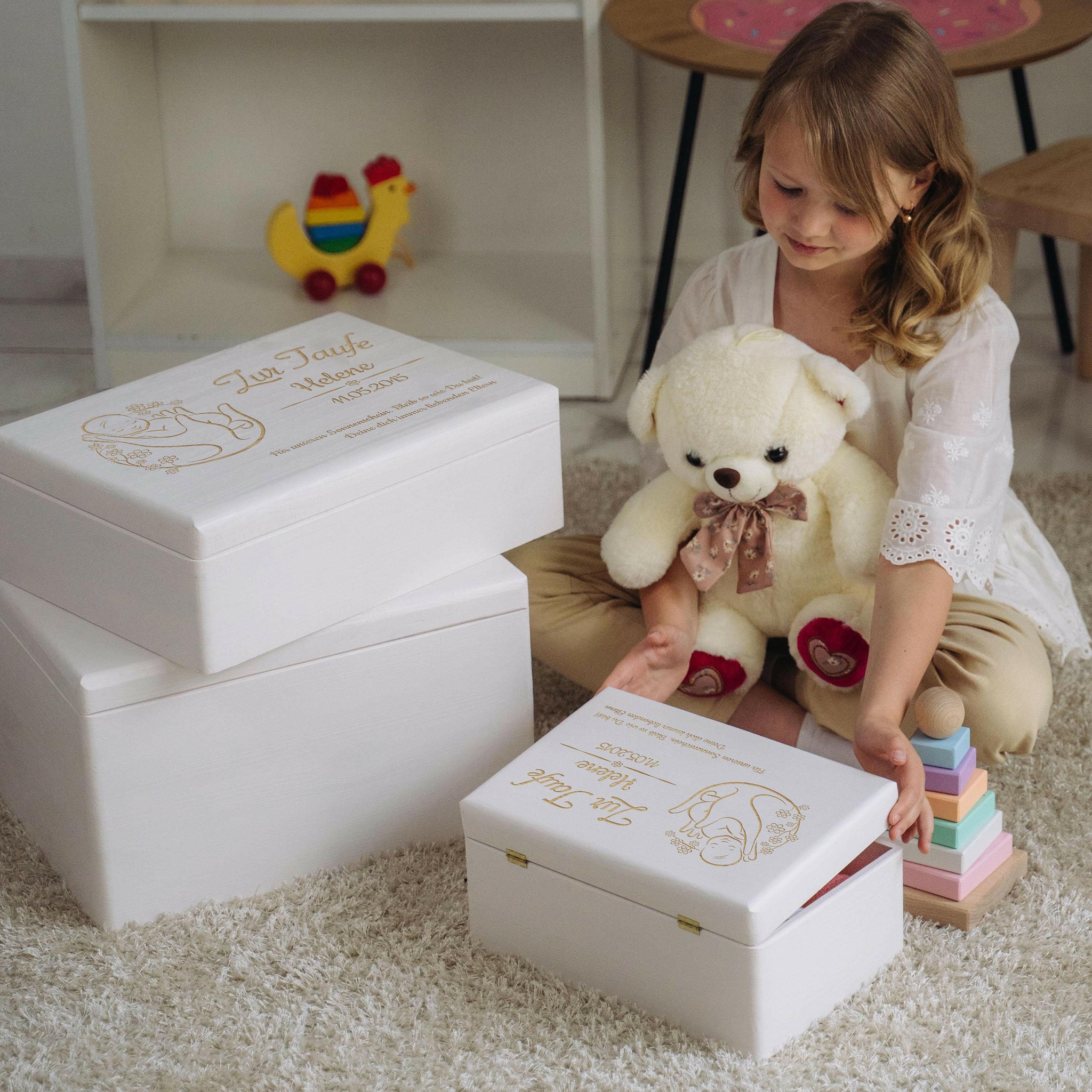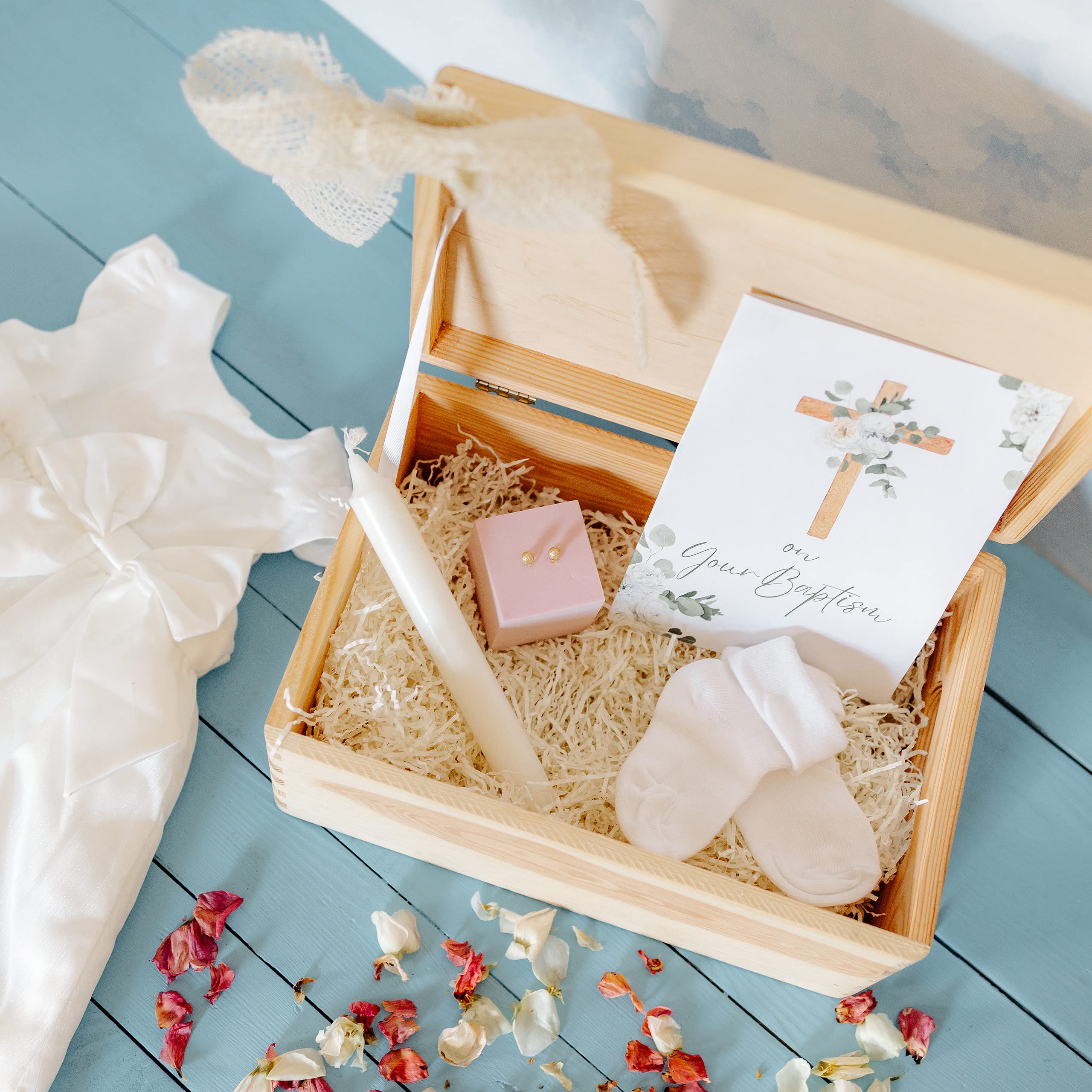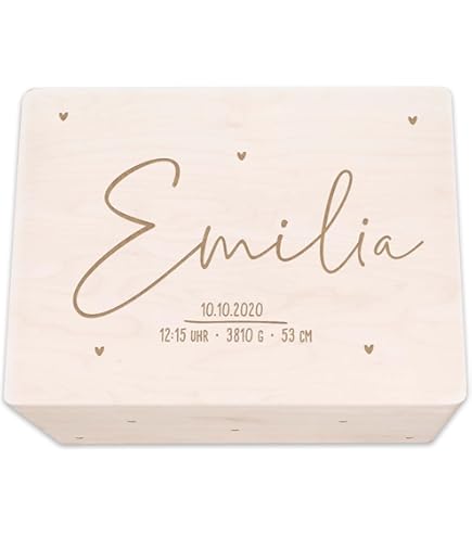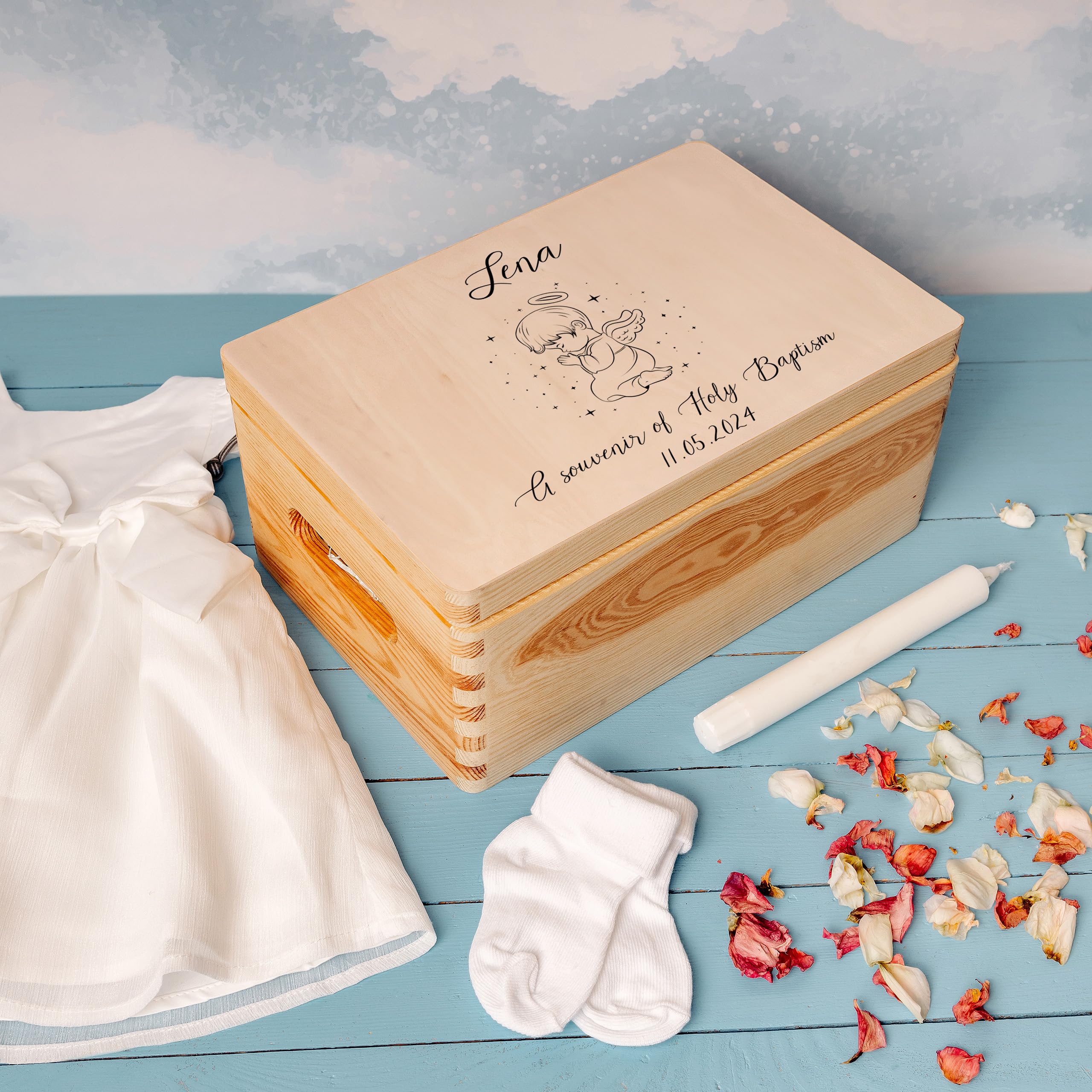 Ein ganz besonderes Geschenk zur Taufe! Diese wunderschöne weiße Holzkiste kannst du mit bis zu 3 persönlichen Texten individualisieren - zum Beispiel mit dem Namen des Kindes, dem Taufdatum und einem Wunschtext. Wähle zwischen zwei eleganten Designs: Betender Engel oder heilige Kerze. Die Box misst 30x20x14cm außen und bietet innen (27,5x17,5x9,8cm) genug Platz für Taufkerzen, die weiße Taufkleidung, Geldgeschenke, Karten und Erinnerungsfotos. Hergestellt in der EU aus hochwertigem, unbehandeltem Naturholz. Perfekt um die schönsten Erinnerungen an diesen besonderen Tag sicher aufzubewahren. Die Holzkiste ist auch als Spardose nutzbar und wird zu einem wertvollen Erinnerungsstück, das das Kind ein Leben lang begleitet. Ein Geschenk, das von Herzen kommt und bleibende Freude bereitet!