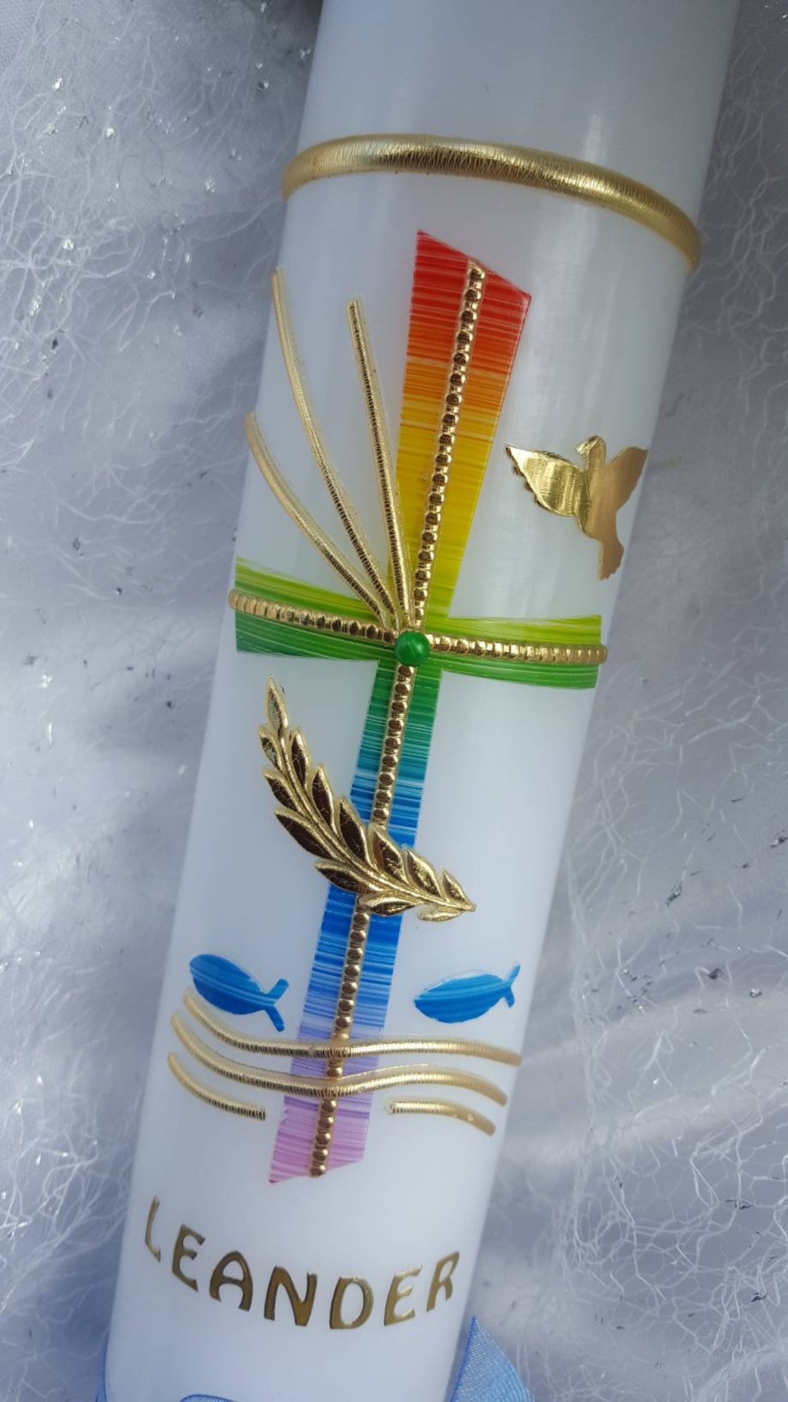 Eine ganz besondere Kerze für einen ganz besonderen Tag! Diese wunderschöne Tauf- oder Kommunionkerze wird für dich in liebevoller Handarbeit gefertigt. Mit den Maßen 300mm Höhe und 50mm Durchmesser ist sie ein imposanter Blickfang bei der Feier. In hellem Blau mit silbernen Akzenten gehalten, strahlt sie eine festliche und dennoch zarte Atmosphäre aus. Das Besondere: Jede Kerze wird erst nach deiner Bestellung individuell für dich angefertigt. Du kannst sie nach dem Kauf mit deinem persönlichen Beschriftungswunsch versehen - einfach über 'Verkäufer kontaktieren' den gewünschten Text mitteilen. So wird jede Kerze zu einem einzigartigen Unikat und bleibenden Andenken an den wichtigen Tag. Die Lieferung erfolgt innerhalb von 2-3 Werktagen nach deiner Textmitteilung. Bei Fragen erreichst du den Hersteller telefonisch - hier bekommst du echten Service aus Deutschland! Eine wunderbare Erinnerung, die noch Jahre später von diesem besonderen Ereignis erzählt.